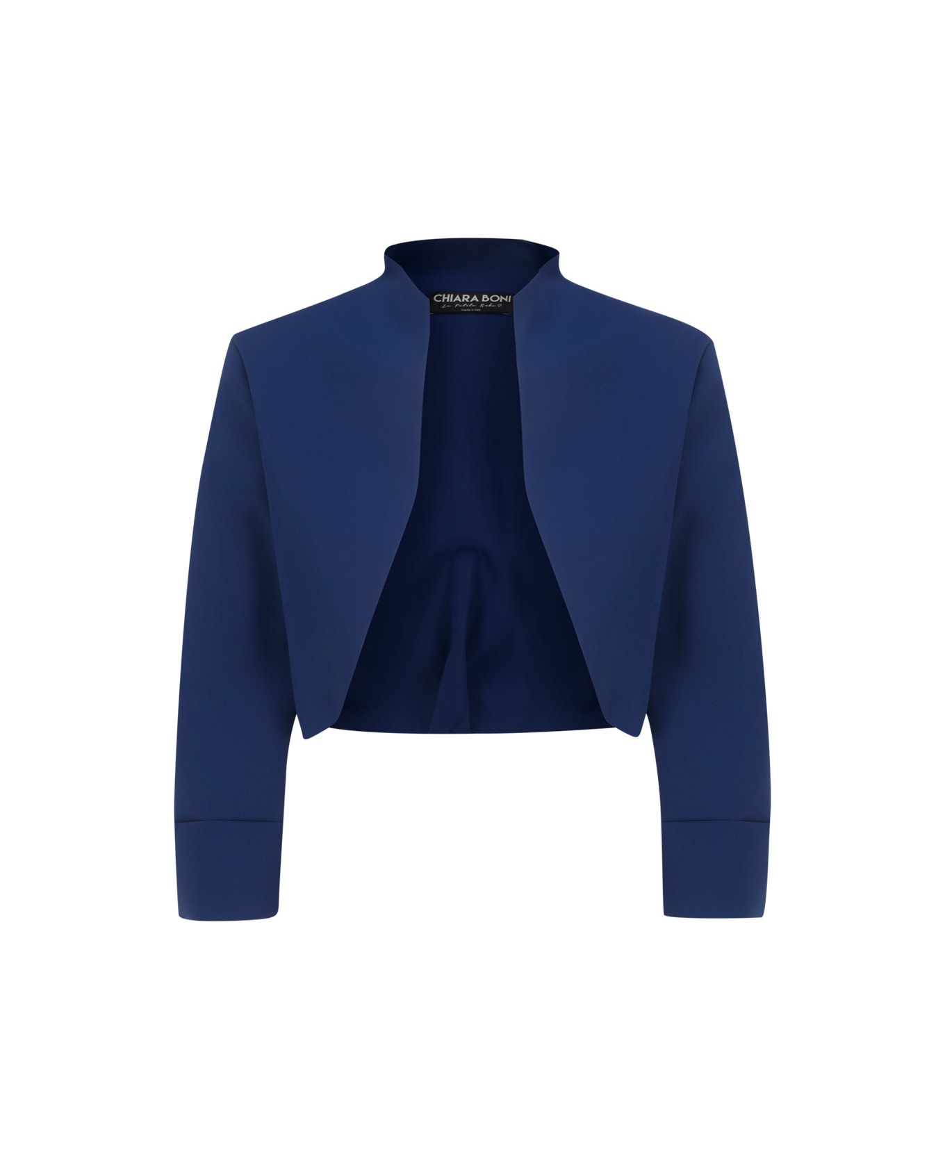 Mativel Jacket by Chiara Boni, Giacchetta Mativel di Chiara Boni, modello cropped aperta sul fronte, maniche lunghe con orlo cucito tono su tono, colletto alto, etichetta brand ricamata a contrasto all'interno.