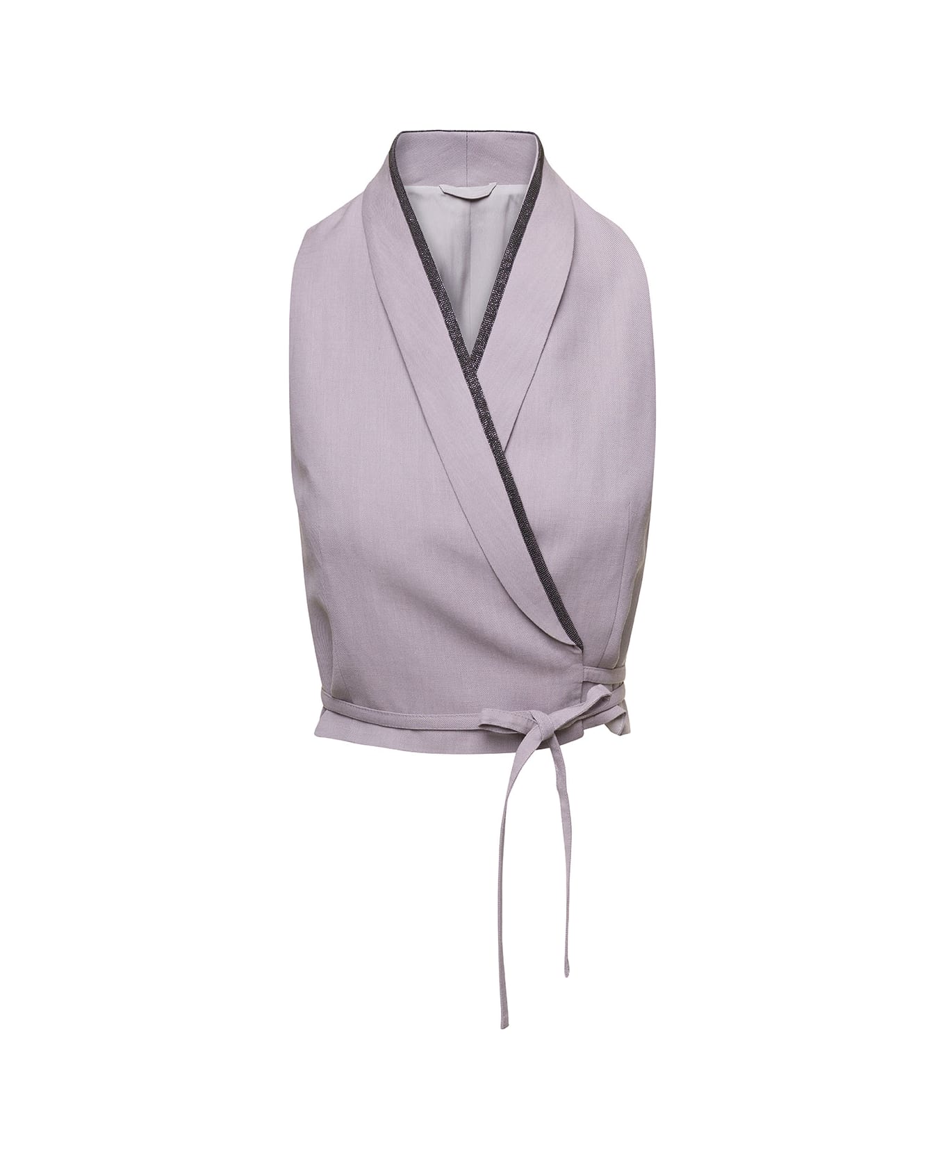 Gilet jacket Cropped design Contrasting trim Shawl lapelsSleevelessWrap design Fastening LilacSik and linen blendRegular fit Composition: