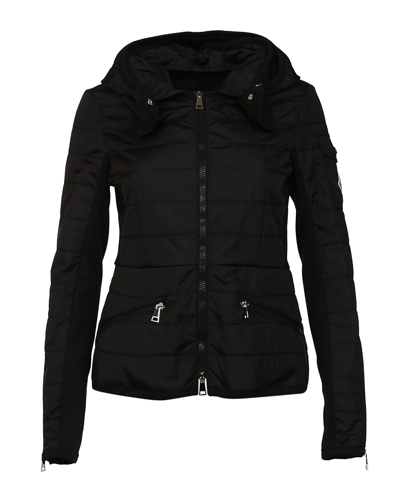 Hooded Jacket from Moncler: Black Hooded Jacket with padded design, long sleeves, zipped cuffs, logo patch on sleeve, front zipped pockets and front zip fastening