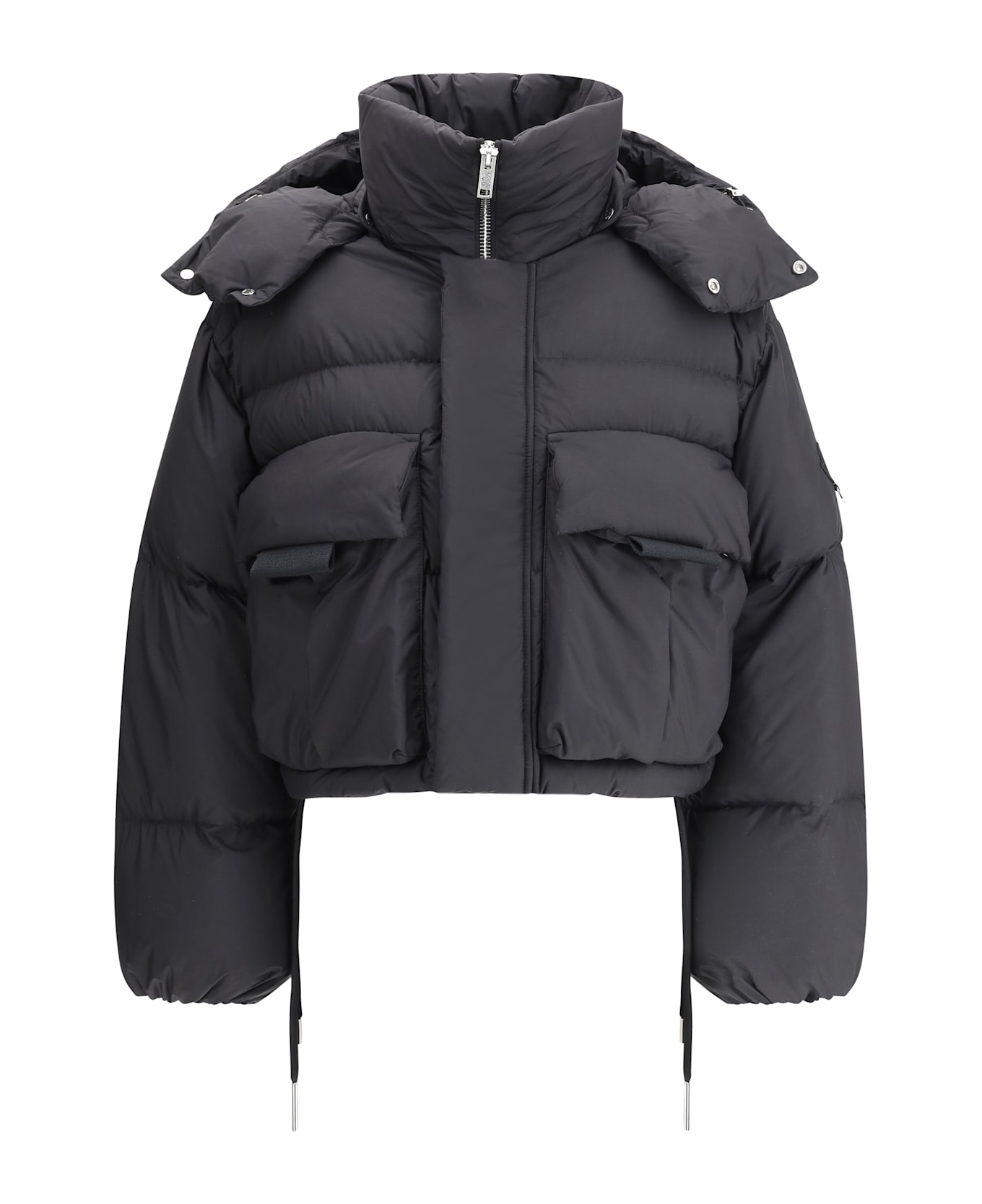 Kar down jacket by moncler x willow smith, cropped model, high collar, removable hood embellished with contrasting maxi eyelets, front zipper and snap button flap closure, two maxi flap patch pockets on front, adjustable drawstring hem, iconic brand logo patch applied on left sleeve, elastic cuffs, all-over quilted and padded design, loose fit.