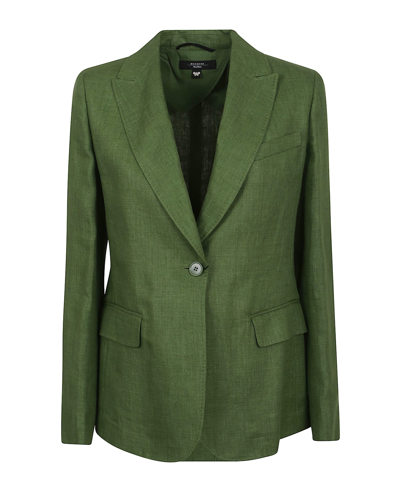 NALUT blazer in pure washed linen by WEEKEND MAX MARA. Semi-lined model; lapel collar; breast pocket and welt pockets with applied flap; front closure with single button also present on the cuffs. Single-breasted design, slightly flared fit with central vent on the back.