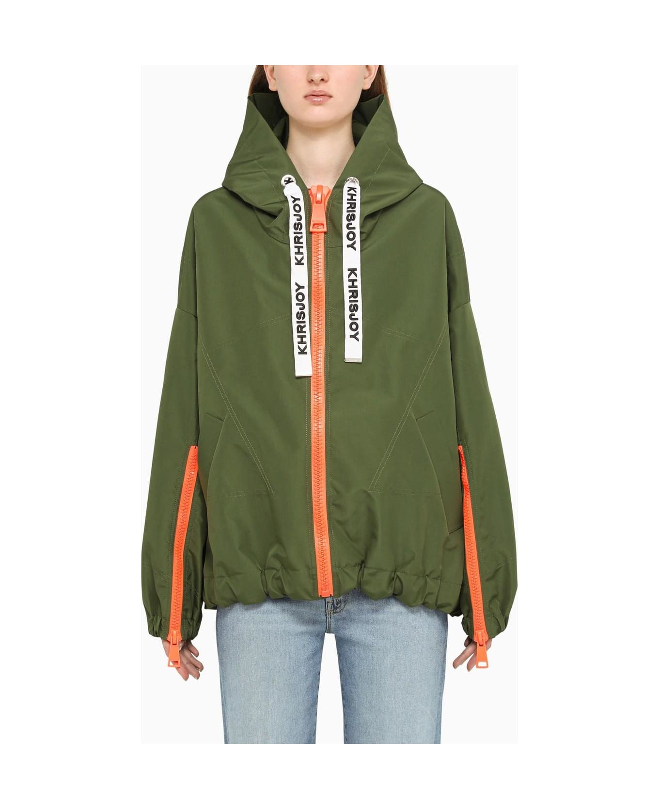 Lightweight jacket by Khrisjoy in olive green nylon, featuring a hood with drawstring, contrasting orange zip at front and bottom sleeve, two front pockets and white grosgrain laces with all-over logo print.