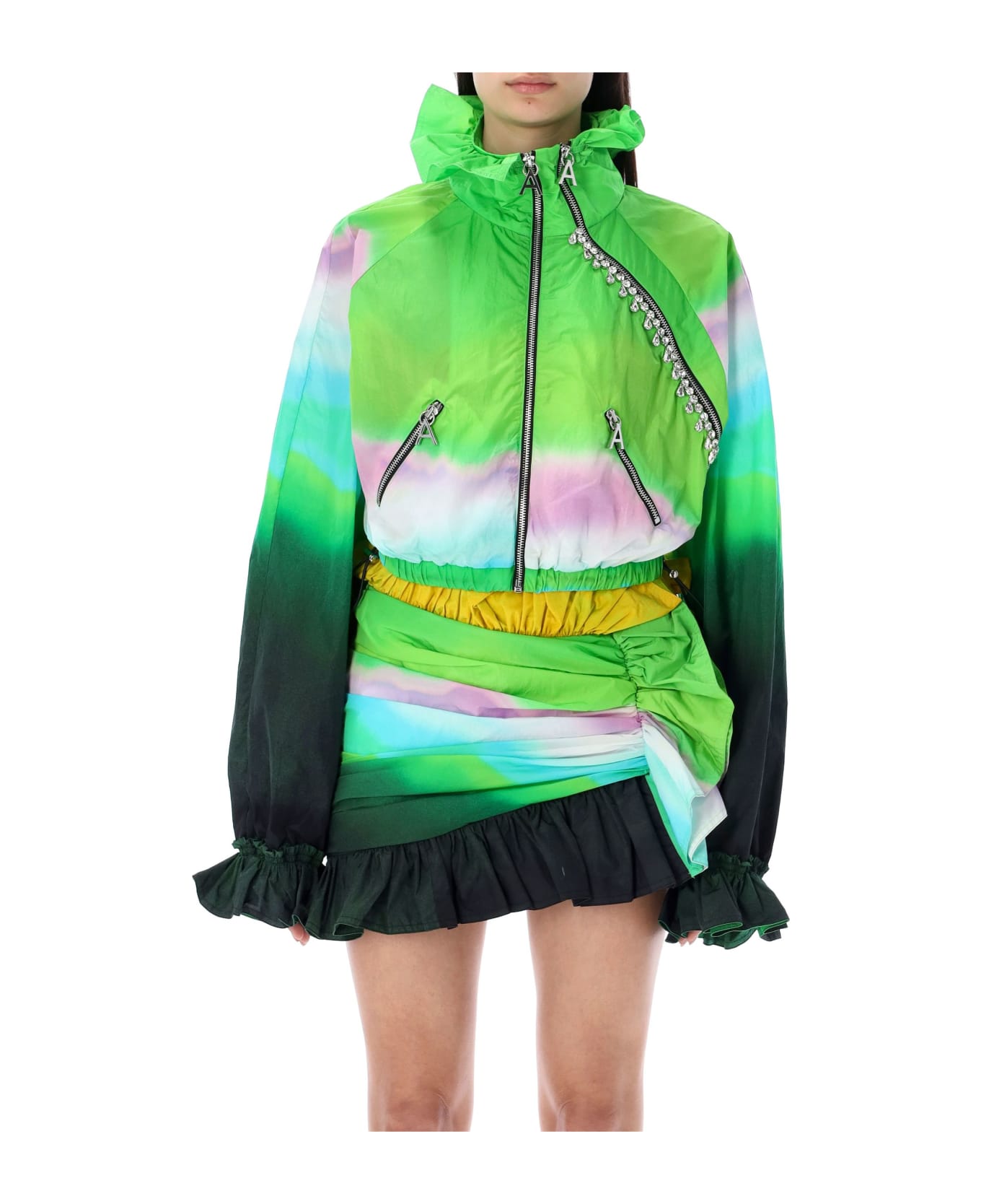 Ombre Nylon Ruffle Jacket By Area. Featuring: High Collar With Ruffle Front Zip Closure Long Sleeves With Ruffle Cuffs Side Zip Pockets Decorative Detail Applied On The Left Side Elastic Drawstring Hem Cropped Style