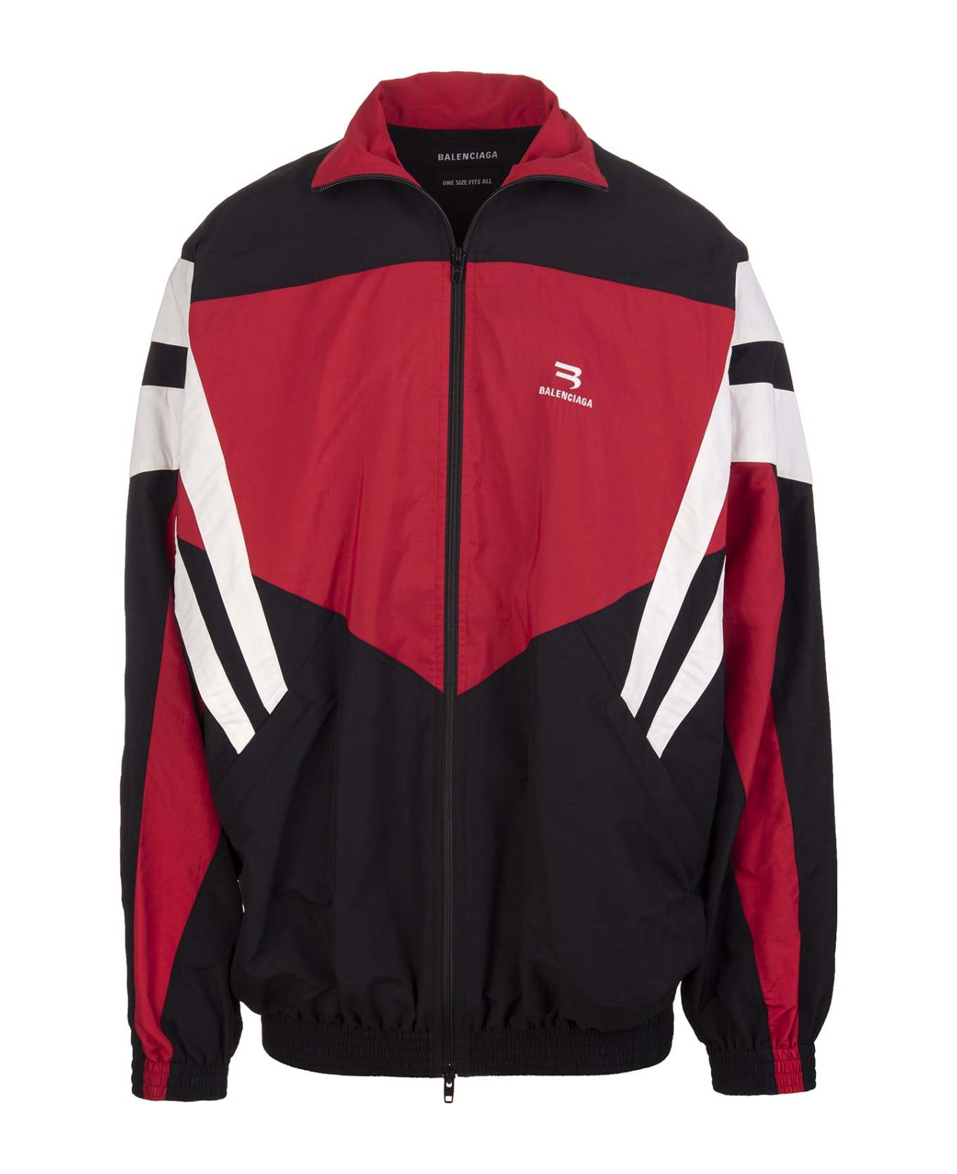 Black, red and white One Size Tracksuit jacket designed by Balenciaga made of nylon and characterized by an oversize fit, high collar, long sleeves, two oblique pockets, ribbed elastic profiles, contrasting stirrups on the front, front zip closure and white Sporty B embroidery.
