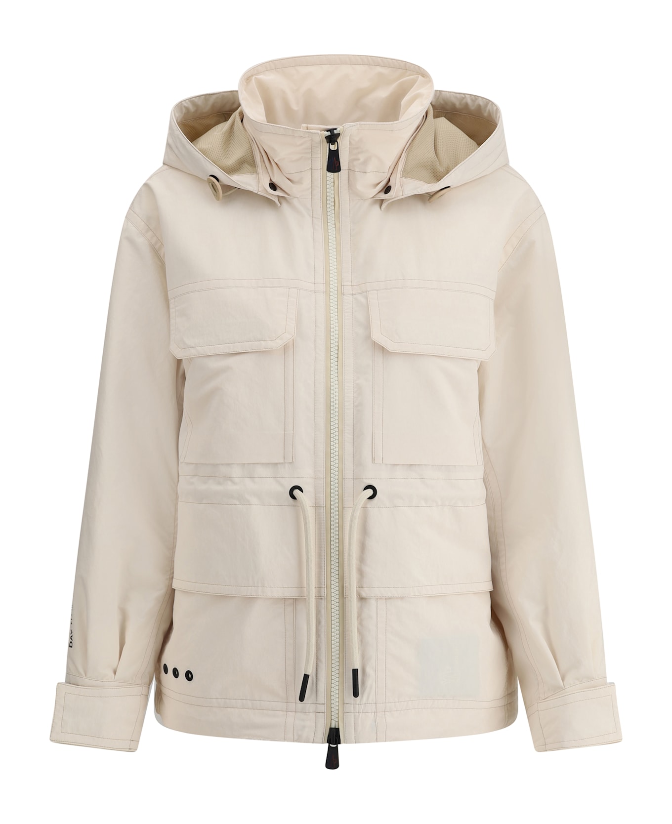 Parka nimba jacket by moncler grenoble, model with removable snap-button adjustable hood with couliusse, double-slider front zipper closure, four flap patch pockets on front, drawstring waist, leather co logo patch applied on left sleeve.