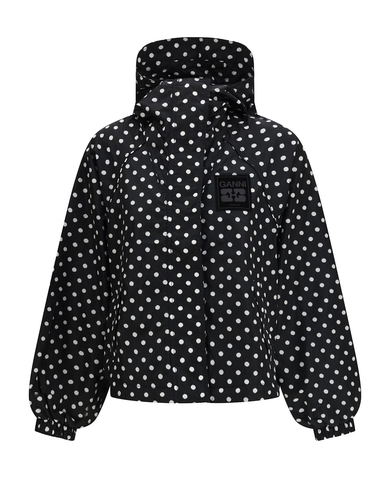 The printed nylon jacket by ganni captures the brand s playful yet modern urban spirit. crafted from lightweight nylon with a polka-dot print, it features a relaxed silhouette enhanced by wide, loose sleeves that create effortless movement. the hood and front zip closure emphasize its functional appeal, while zipped side pockets add everyday practicality. a ganni logo patch on the chest provides a distinctive graphic signature. a versatile outerwear piece designed to elevate contemporary looks with ease and character.