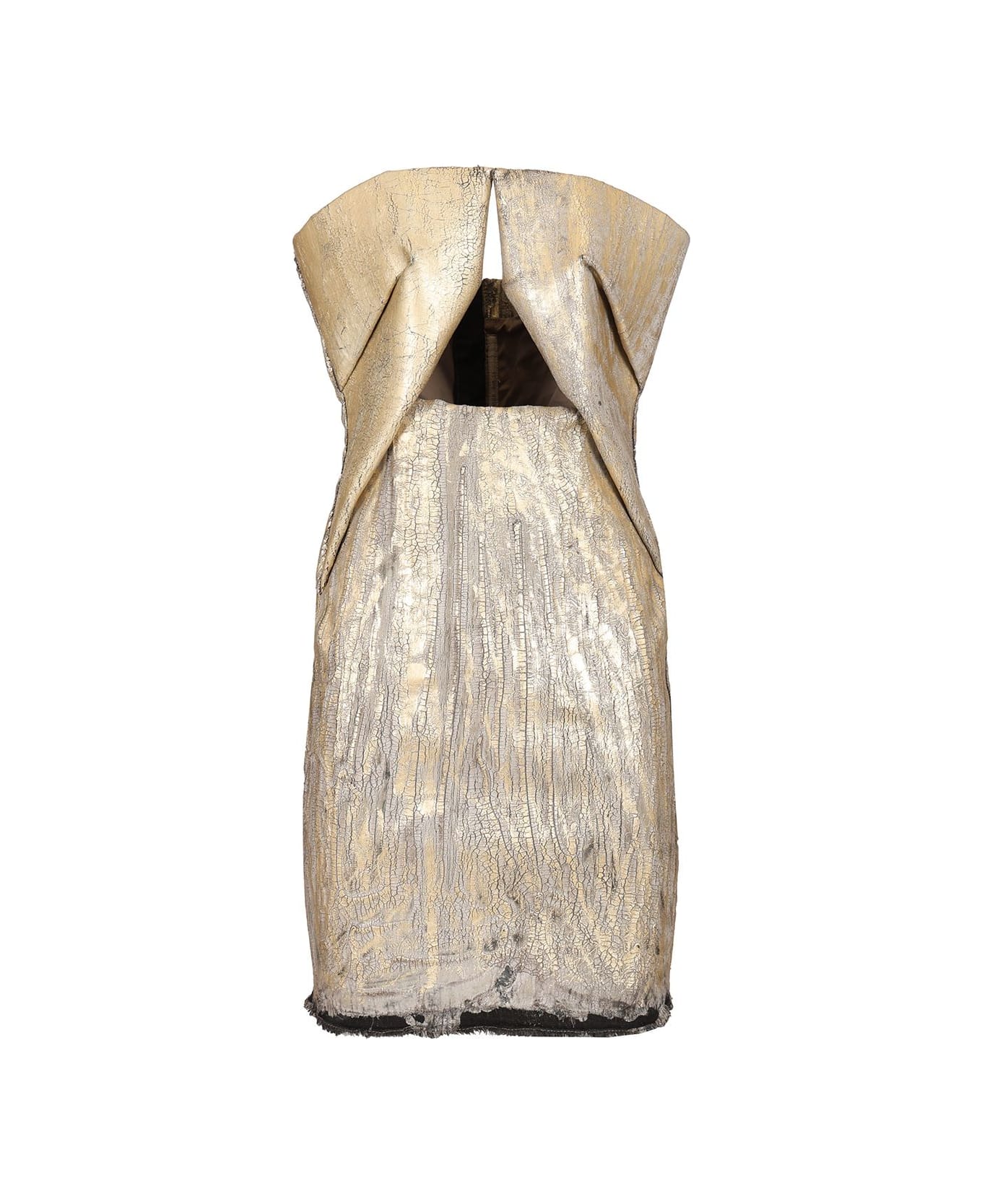 Rick Owens "Prong Mini" dress made from a cotton and elastomultiester blend, featuring a crackled gold surface and a geometric strapless neckline. It features a raw finish on the hem and an exposed vertical zip on the back.