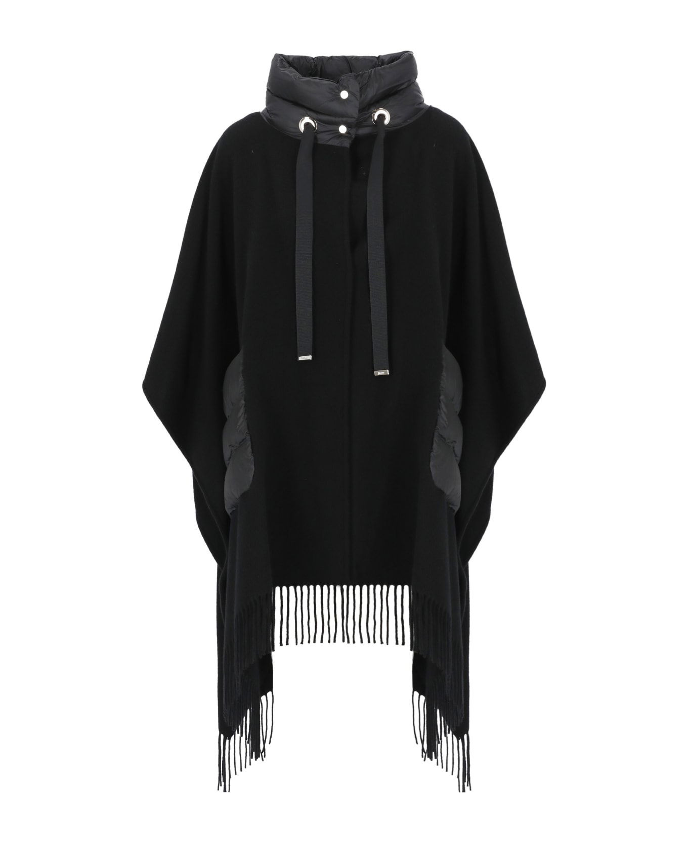 - Black Herno wool poncho for woman - High quilted down neck with pression buttons and drawstrings - Fringes at hem - Two front quilted welt pockets