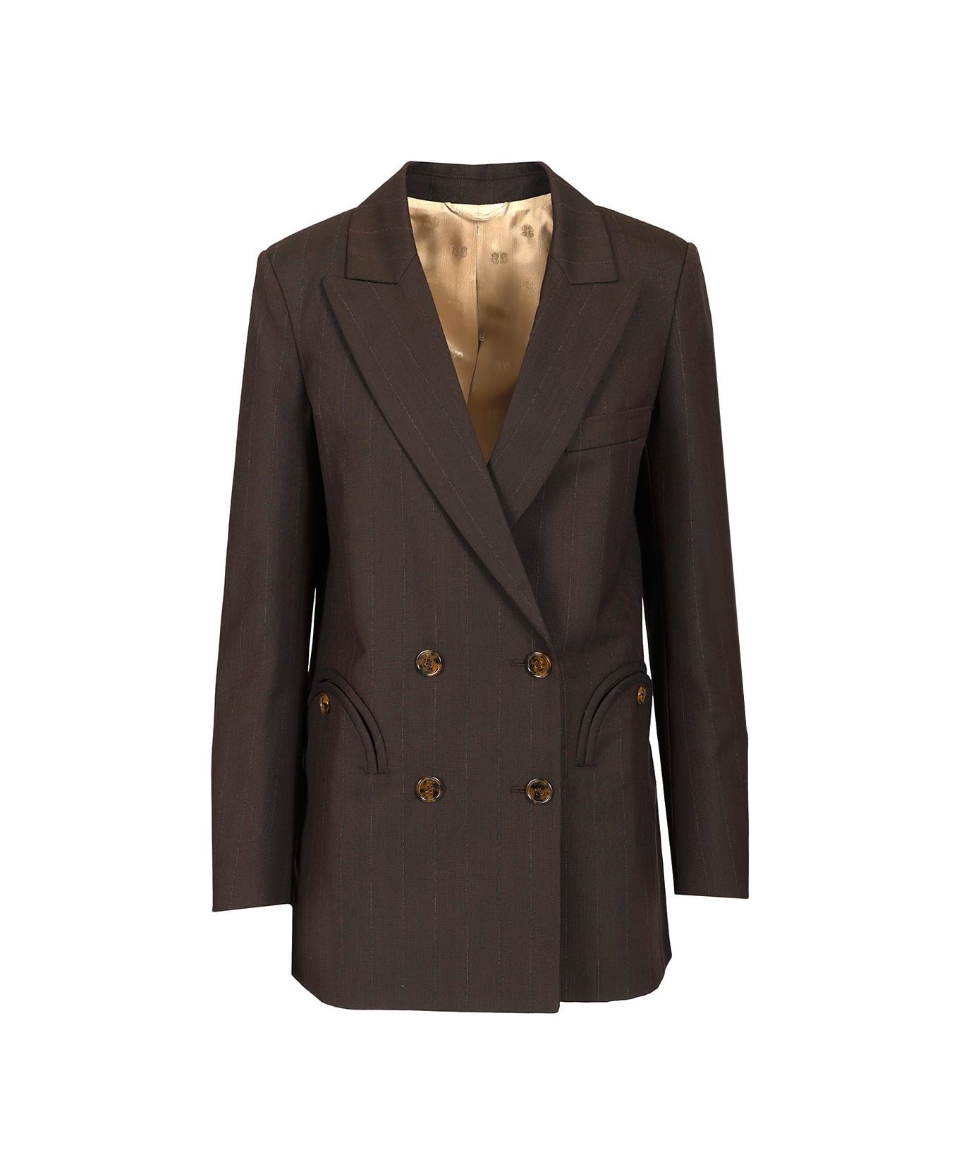 "Rigel" double-breasted blazer from Blazè made of light chocolate brown virgin wool fabric with pinstripe pattern, tortoiseshell buttons, camel satin lining, padded shoulders, vent on the back. Regular fit.