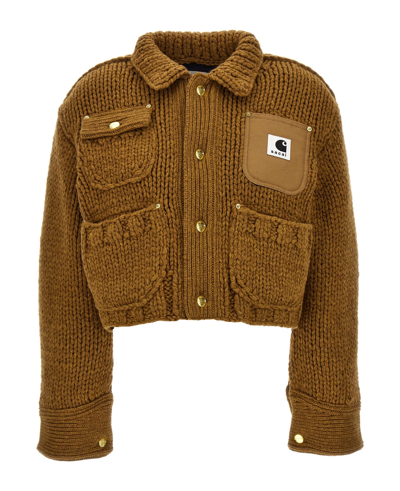 Sacai x Carhartt WIP wool jacket with crop style with snap button closure and multipockets with logo patch.