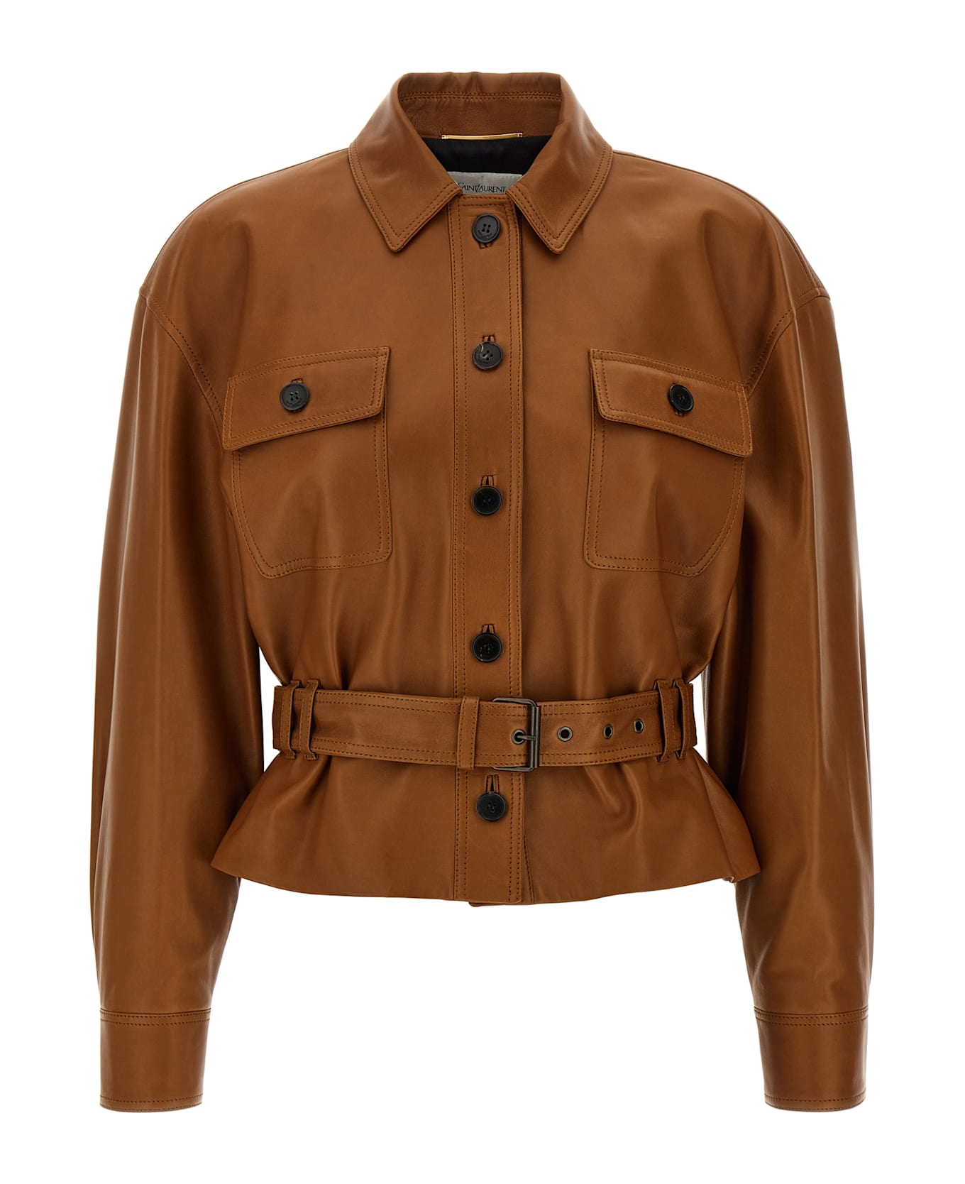 'Saharienne' leather jacket, belt with adjustable buckle at the waist, collar, front pockets, front button closure, long cuffed sleeves.