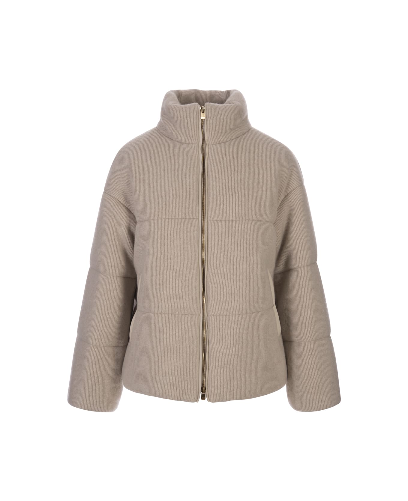Women's puffer jacket by Agnona made of sand-coloured corduroy and featuring a quilted design, a high collar, a logo appliqué on the back, flush side pockets with button and a front fastening with a two-way zip. Metal parts with gold-tone finish.