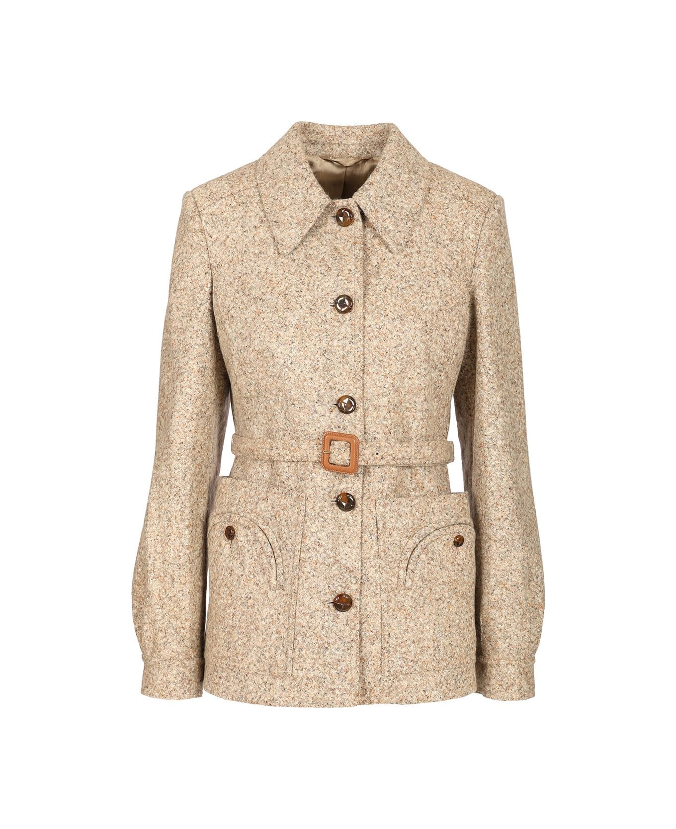 Alpaca blend jacket with belt, leather-covered button closure, round button pockets