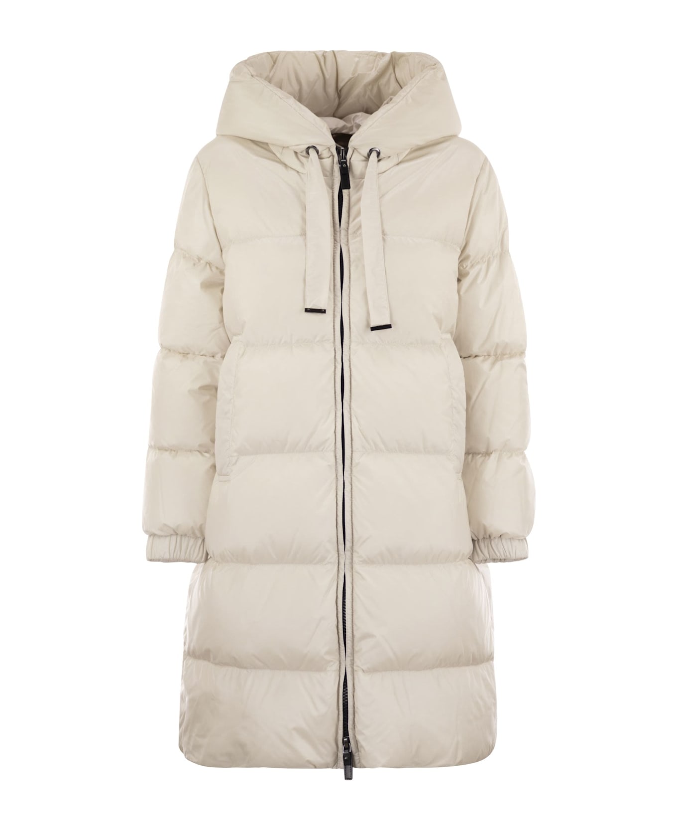 Long goose down jacket made from water-repellent fabric with horizontal quilted pattern and hood. The model features long sleeves and welt pockets on the sides. Full-length front closure with double-slider zip. - Hood - Grosgrain drawstring - Elasticated cuffs - Zip closure DESIGNER ID: 2529496115600 028 Composition: 100% Polyester Padding: 90% Down, 10% Feather
