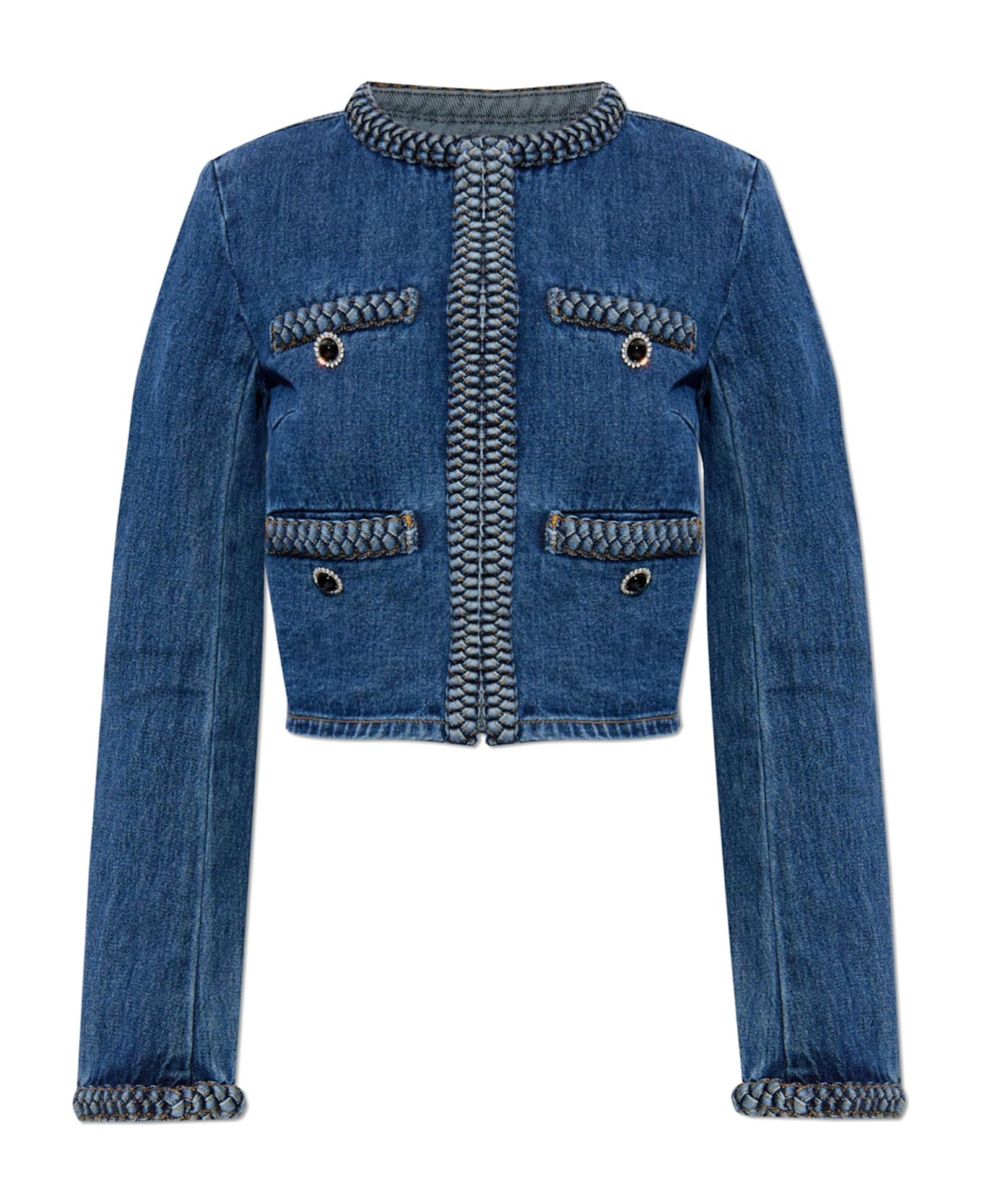 Experience contemporary poise with this exquisite denim jacket by Self-Portrait. Artfully crafted from pure cotton with a distinctive, medium-weight weave, this piece radiates both refinement and enduring comfort. The classic, cropped silhouette is softly tailored for an elegant fit, highlighted by long sleeves adorned with ornate detailing. Pristine in its smooth blue denim, this jacket boasts a braided trim in a contrasting hue, gracefully outlining the neckline, front, cuffs, and pockets an unmistakable design hallmark. Four front flap pockets, each embellished with the same braided motif and finished with oversized, decorative buttons, strike the perfect balance between function and luxury. Why choose this product? Luxurious cotton denim ensures exceptional durability and breathability Unique braided edging elevates the classic silhouette Versatile design transitions seamlessly from casual to refined occasions Thoughtful details and four ample pockets add contemporary sophistication Designed by Self-Portrait celebrated for romantic elegance fused with modern sensibility
