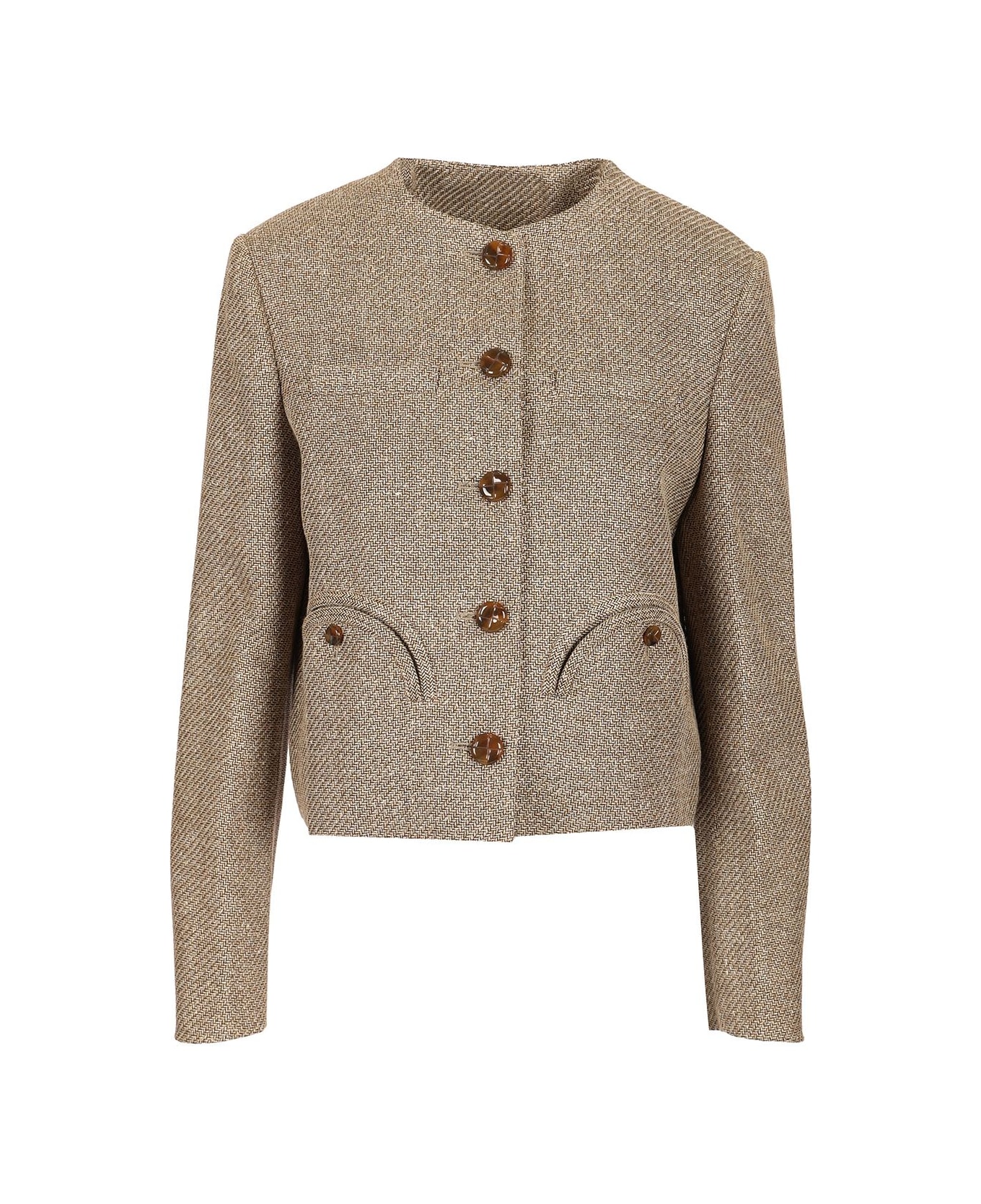 "Shamo Saratoga" linen, cotton and silk bolero jacket by Blazé. Above-the-hip length. Brown loden-style button fastening. Lightly padded shoulders. External smiley pockets.