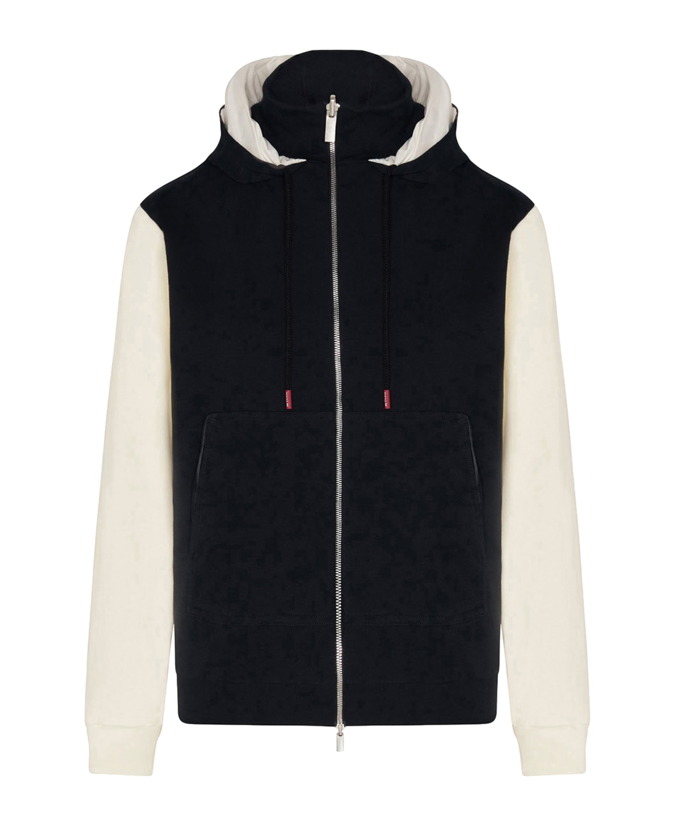 Hooded sweatshirt made from soft fleece-effect cotton yarn in black with white sleeves. The garment features a zip fastening and two pouch pockets, the hood is adjustable via a herringbone cotton drawstring that has a laser-embossed Kiton logo agletat the end. . Ergonomic shapes and sophisticated details ensure comfort and freedom of movement whilst respecting sophisticated taste. We recommend hand washing the garment inside-out. Do not bleach; do not tumble dry. Iron inside-out at a low temperature.
