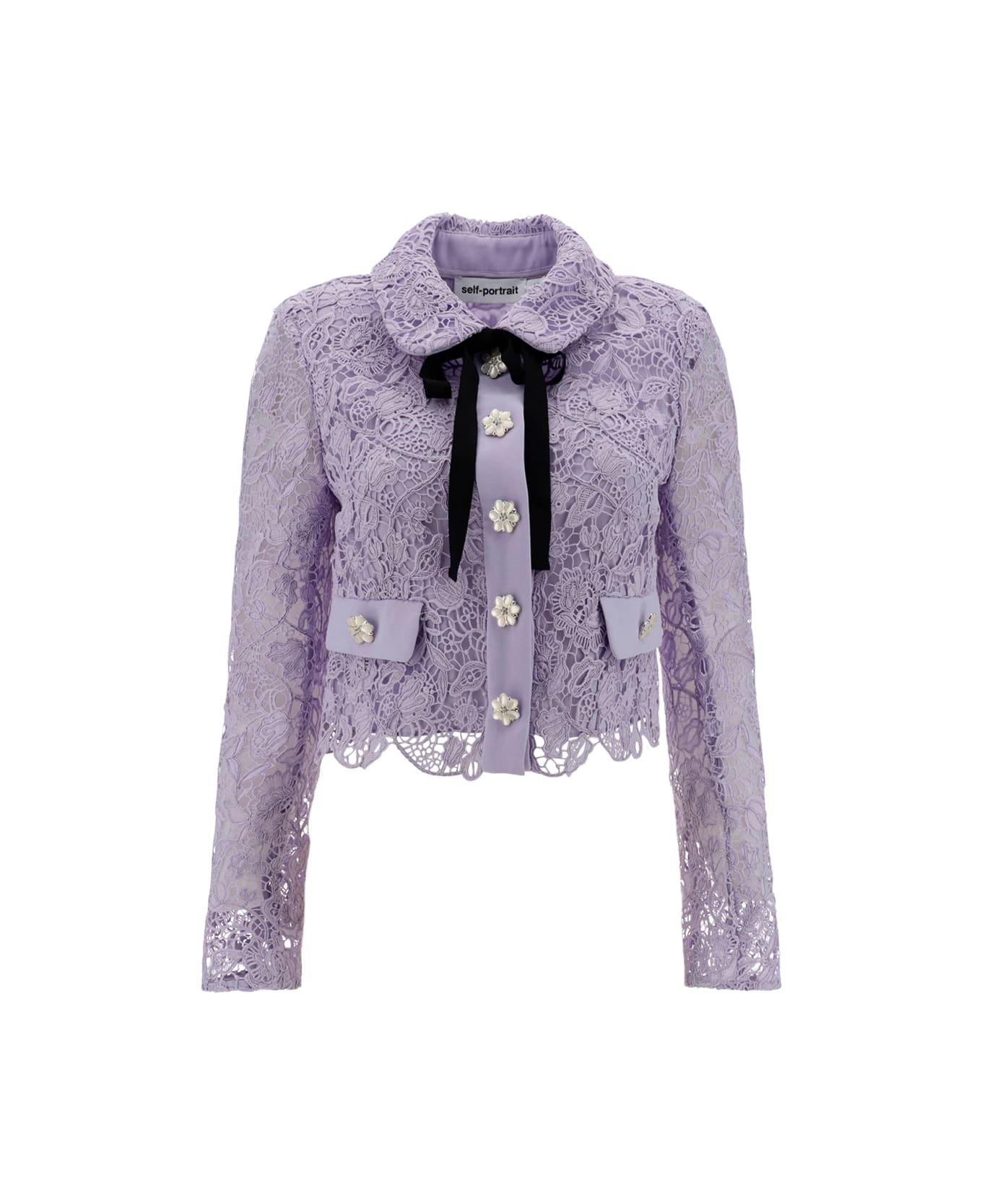 Shirt by self-portrait, classic collar, contrasting tie applied to the neckline, front fastening with floral buttons, two patch pockets on the front with flap for closure, floral lace design, regular fit.