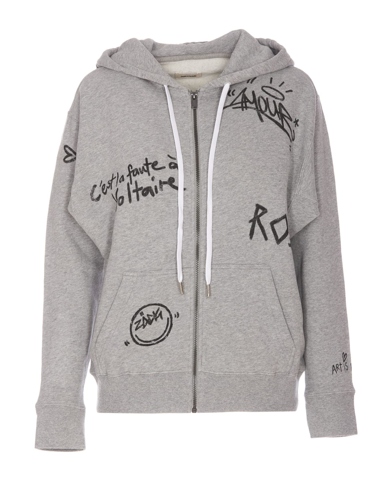 Zadig&Voltaire grey Spencer Manifest hoodie, frontal zip closure, long sleeves, elasticized cuffs, lateral pockets, printed Composition: 81% Cotton, 19% Polyester