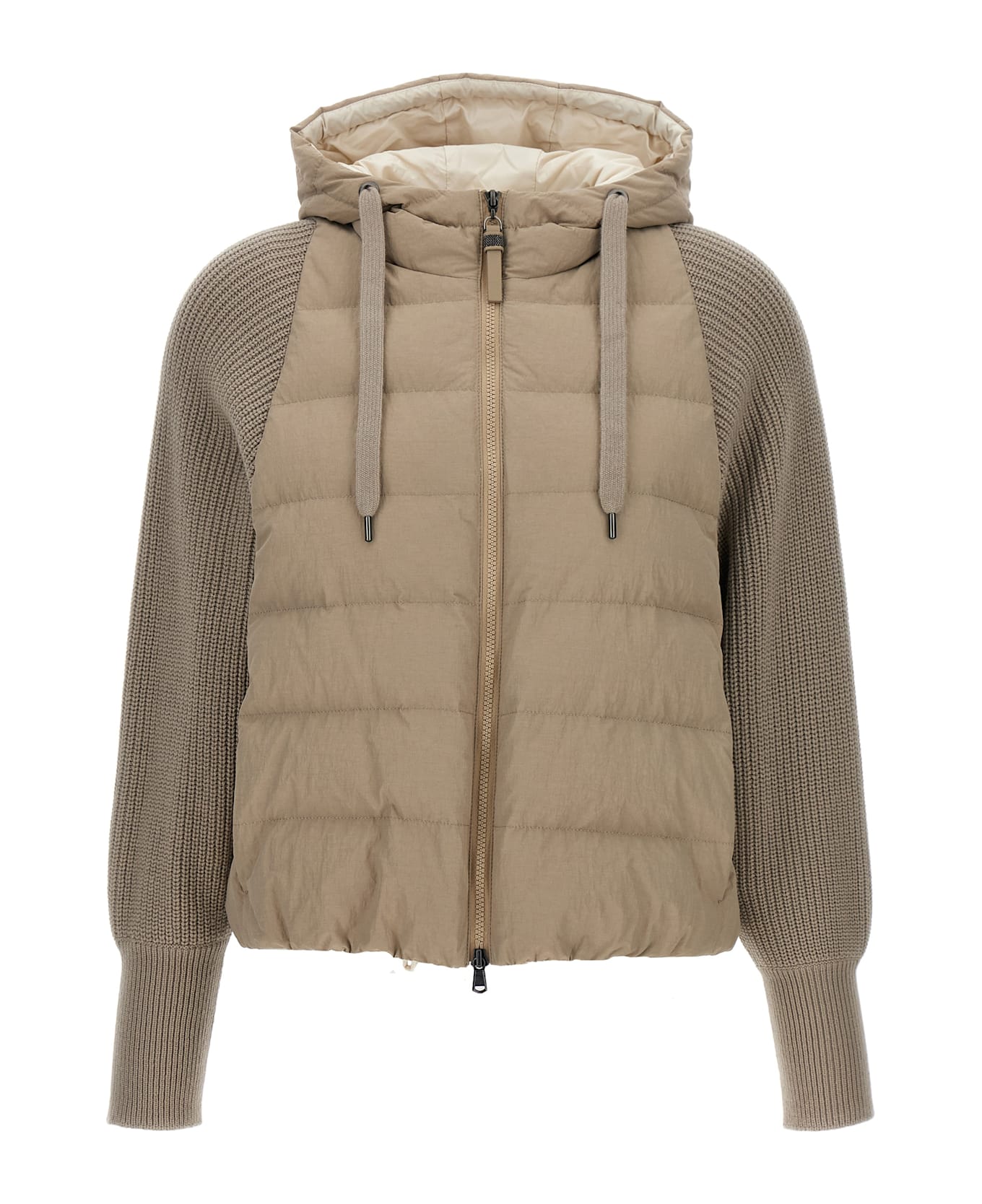Two-material water-repellent nylon down jacket with goose down padding with virgin wool, cashmere and silk knit sleeves, hood, zip closure with front Monile tie rod, pockets, long wide sleeves with cuffs, elastic and drawstring on the hem.