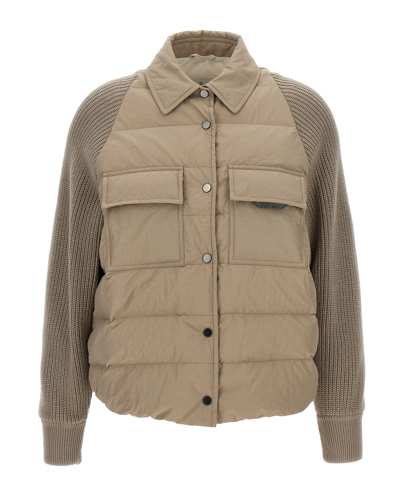 Two-material water-repellent nylon down jacket with goose down padded with virgin wool, cashmere and silk knit sleeves, shirt collar, front snap button closure, pockets with Monile 'Shiny Flap Detail', wide long sleeves with cuffs.
