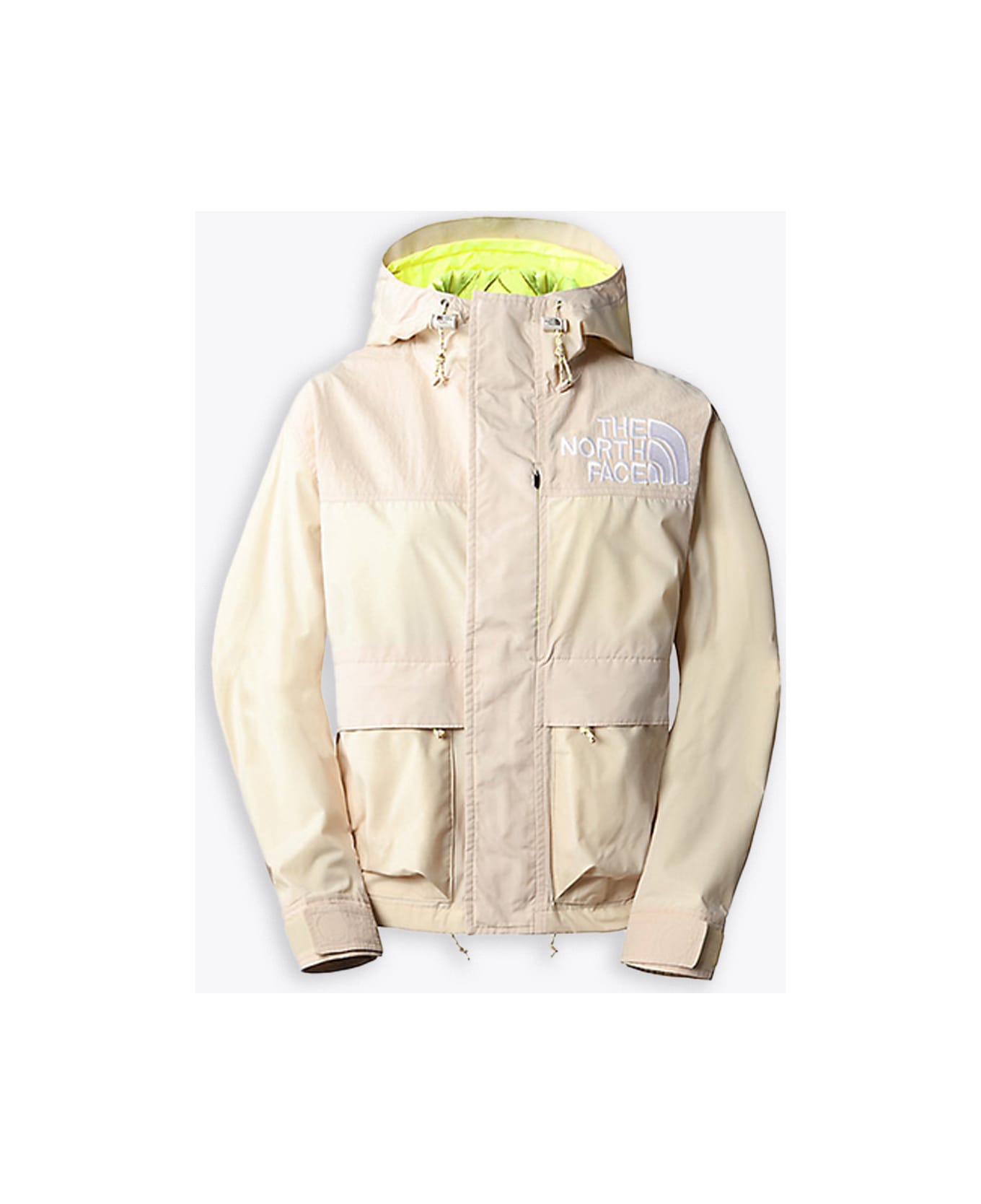 Cream and off-white nylon hooded jacket with drawstring. Zip and snaps closure. Neon yellow lining detail. Chest and back logo embroidery. Two front pockets with zip. Adjustable cuffs with velcro strap. Hidden chest pocket. Drawstring at bottom hem. Cropped fit. Composition: 87% polyester 23% cotton.