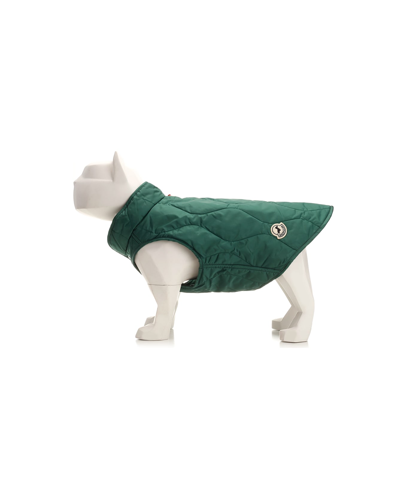 Water repellent dog vest from Moncler in green nylon, padded, snap button closure, logo patch.