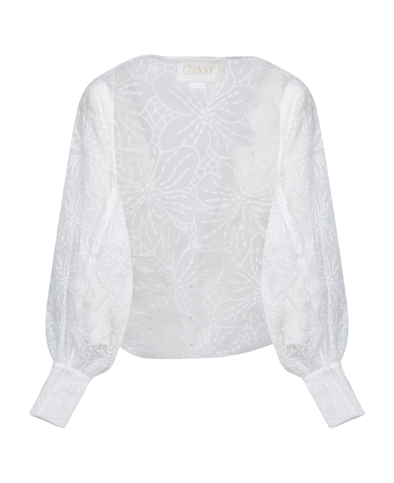 This Genny organza jacket embodies feminine elegance with its delicate and transparent fabric highlighted by a tone-on-tone floral print. The long puffed sleeves add a touch of drama, perfect for special occasions.