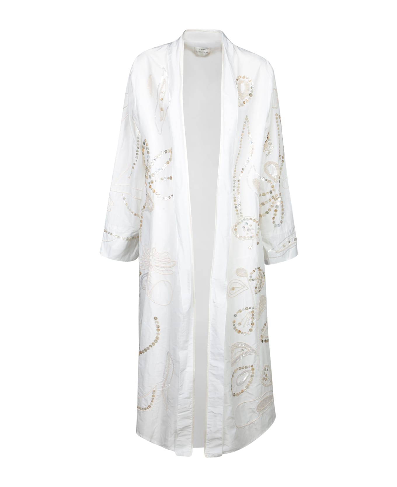 This elegant Forte Forte taffeta duster in soft white is adorned with delicate hand-embroidered pearls, offering a touch of sophisticated elegance.