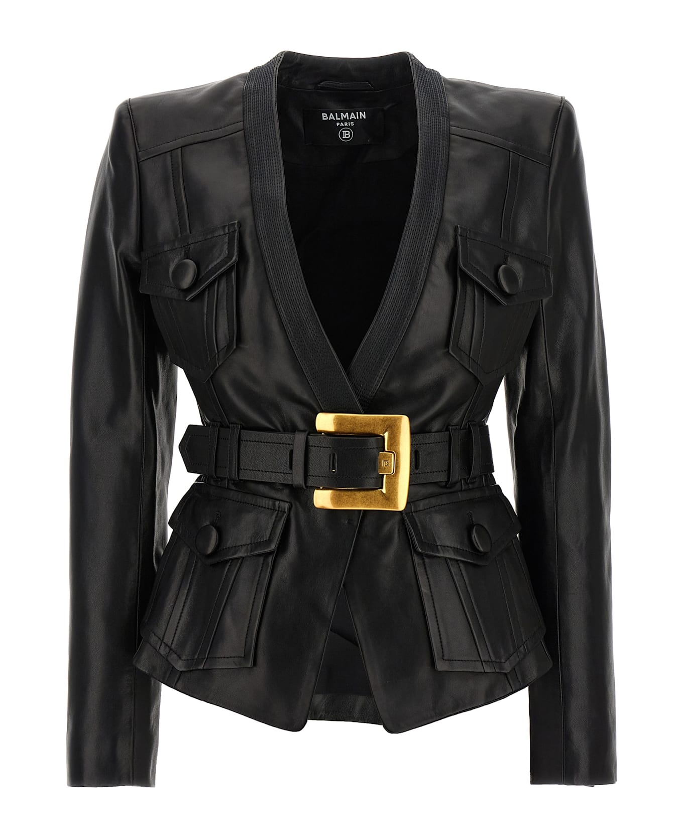 Leather jacket, V-neck, flared style with belt and adjustable buckle at the waist, concealed button closure, long sleeves with buttons. Composition: 100% lamb leather (Ovis aries)