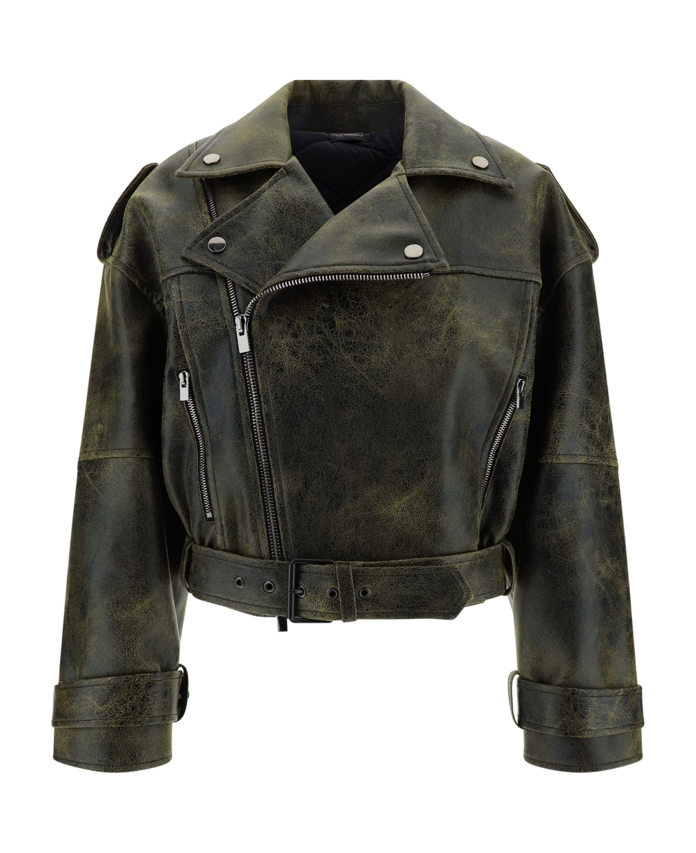 Biker nova jacket by the andamane, geometric collar, wide lapel on the front, asymmetric zipper closure, two side welt pockets, belt loops waist, sash combined with metal buckle, leather effect design, adjustable cuffs by buckle.