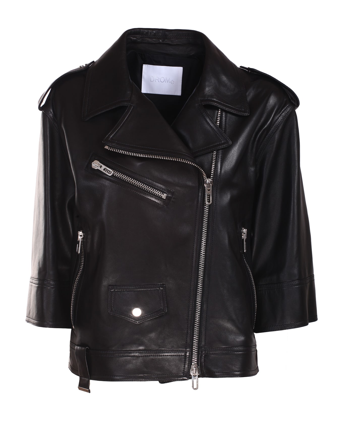 DROMe lambskin biker jacket. Off-centre front zip closure. Tone-on-tone knit collar, bottom and cuffs. Pockets with zip. Small patch pocket with snap. Double slider zip closure. Composition: 100% lamb leather. Made in Italy.