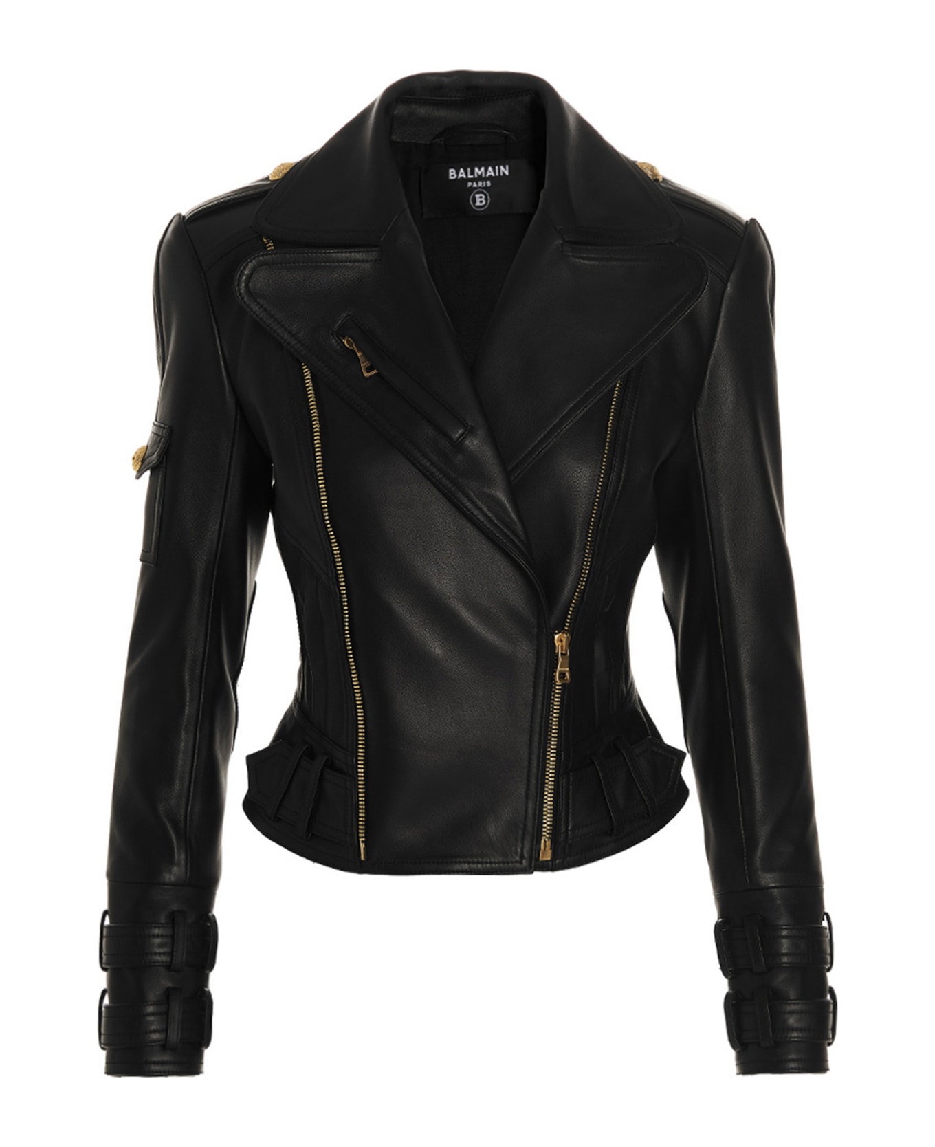 Leather jacket with zip closure, pockets, long sleeves and gold metal details.