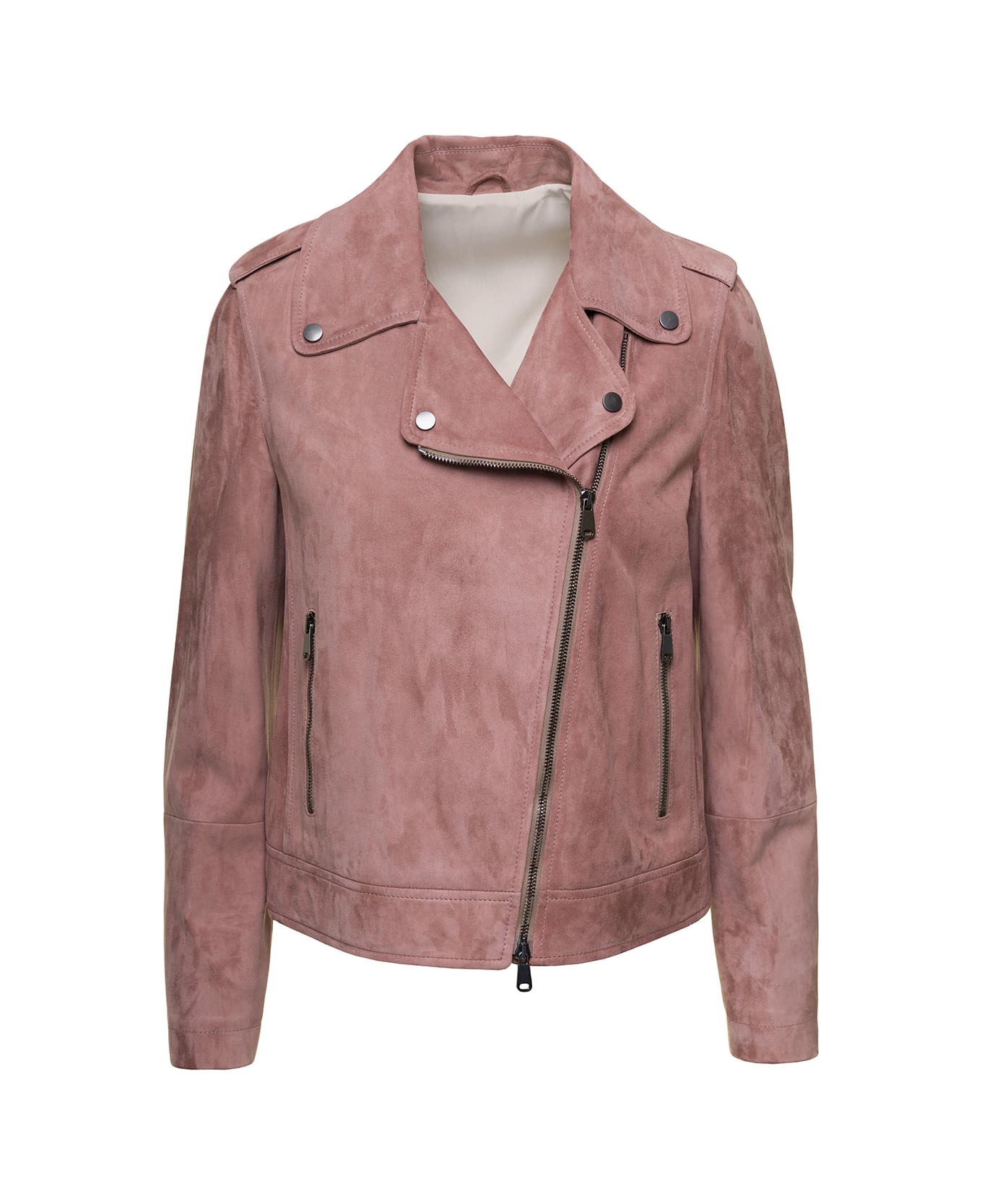 Biker jacketWide notch lapels Off centre front fastening Stud detailing Long sleevesTwo zipped pocketsSuede fabricPink Calf leather Regular fit Composition: