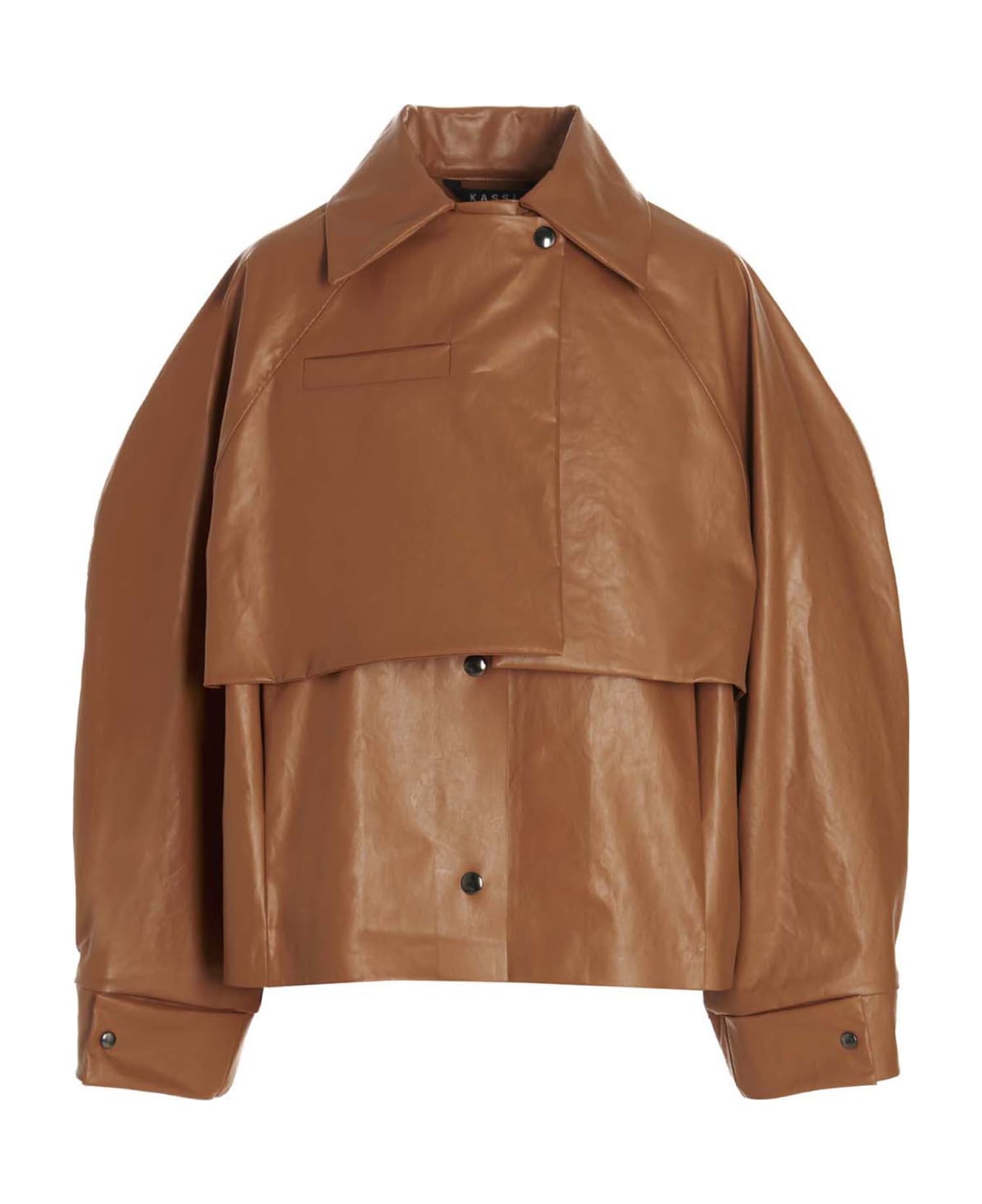 'Pilot' short coat in coated fabric with top panel and snap button closure.