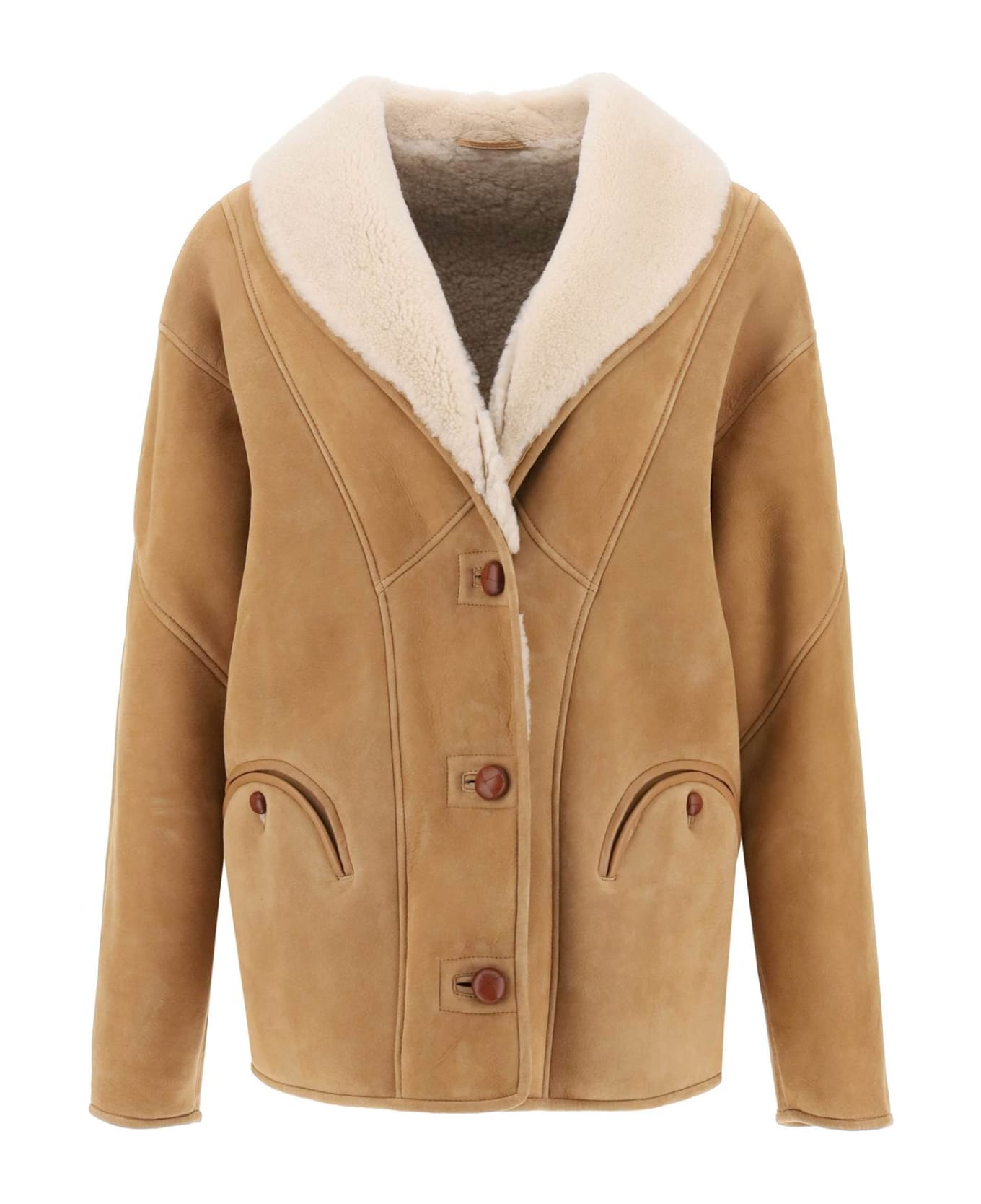 Tatoosh coat by Blazé Milano crafted in shearling with an oversized fit. It features shawl collar, leather coated button closure, buttoned Smiley pockets, piping at front and back. The model is 177 cm and wears a size IT 1.