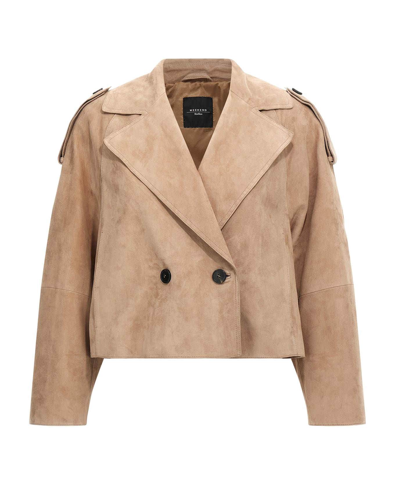 'Maga' short suede double-breasted trench coat with front button closure, wide lapel collar, pockets, long sleeves with wings on the shoulders, back cape, lining.