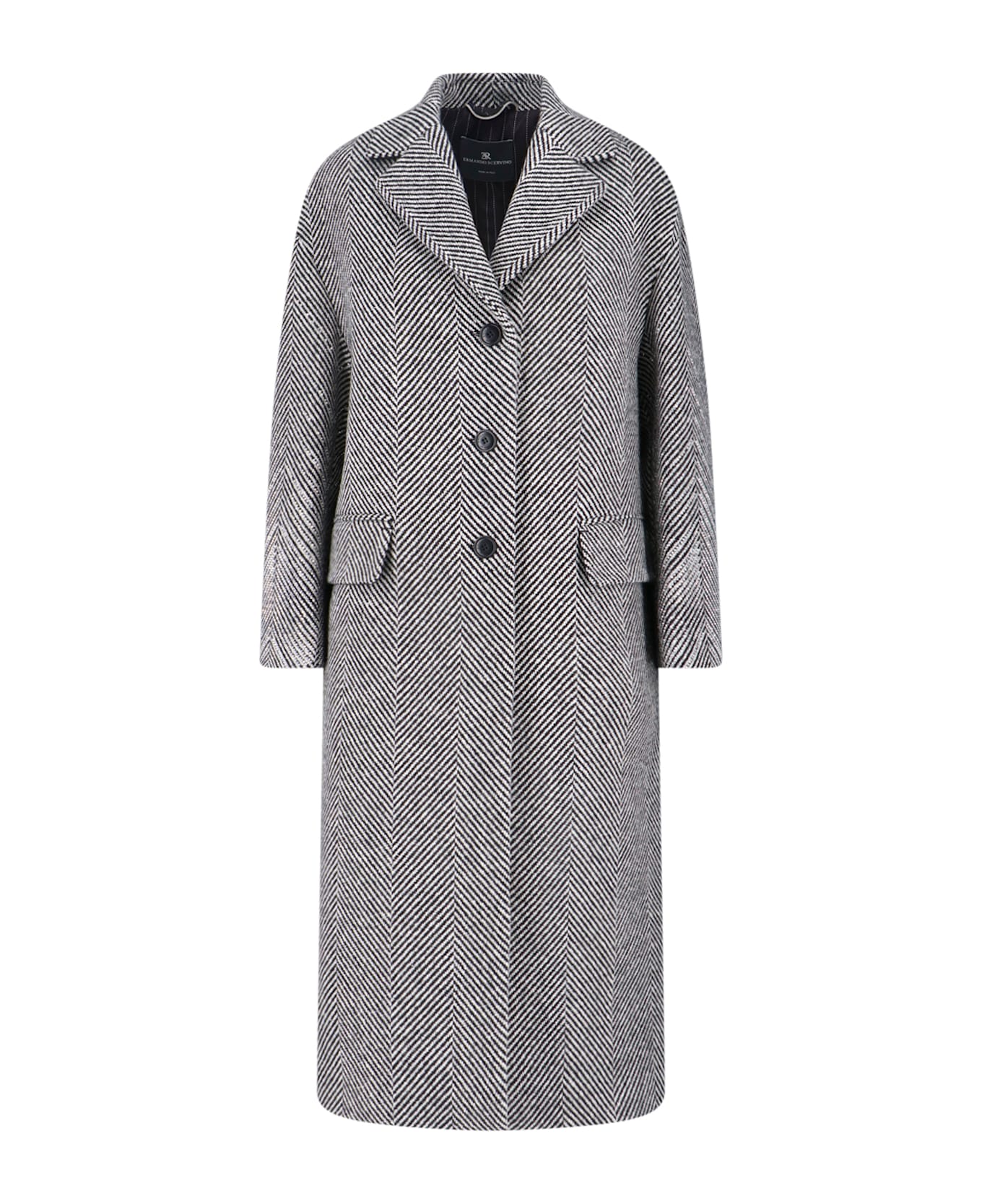 Ermano Scervino maxi coat in black wool and silk blend with houndstooth pattern, classic lapels, button closure, dropped shoulders, two side gusset pockets, back cuff splits, vent at the back bottom.
