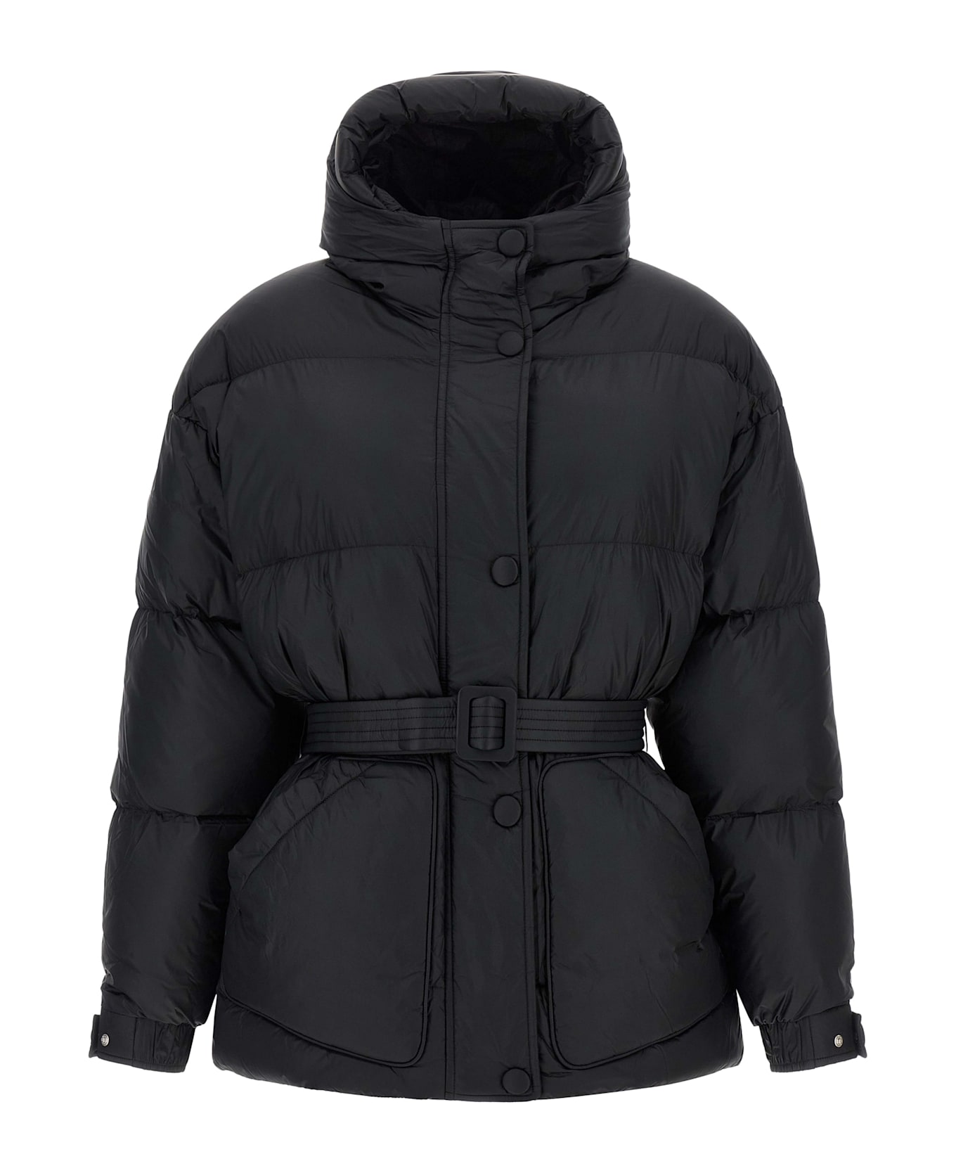 'Michlin' quilted nylon powder down jacket with goose down padding, cotton lining, hood, high neck, front zip and snap button closure, pockets, long sleeves with adjustable elastic cuffs and dropped shoulder, hourglass silhouette with removable belt at the waist.