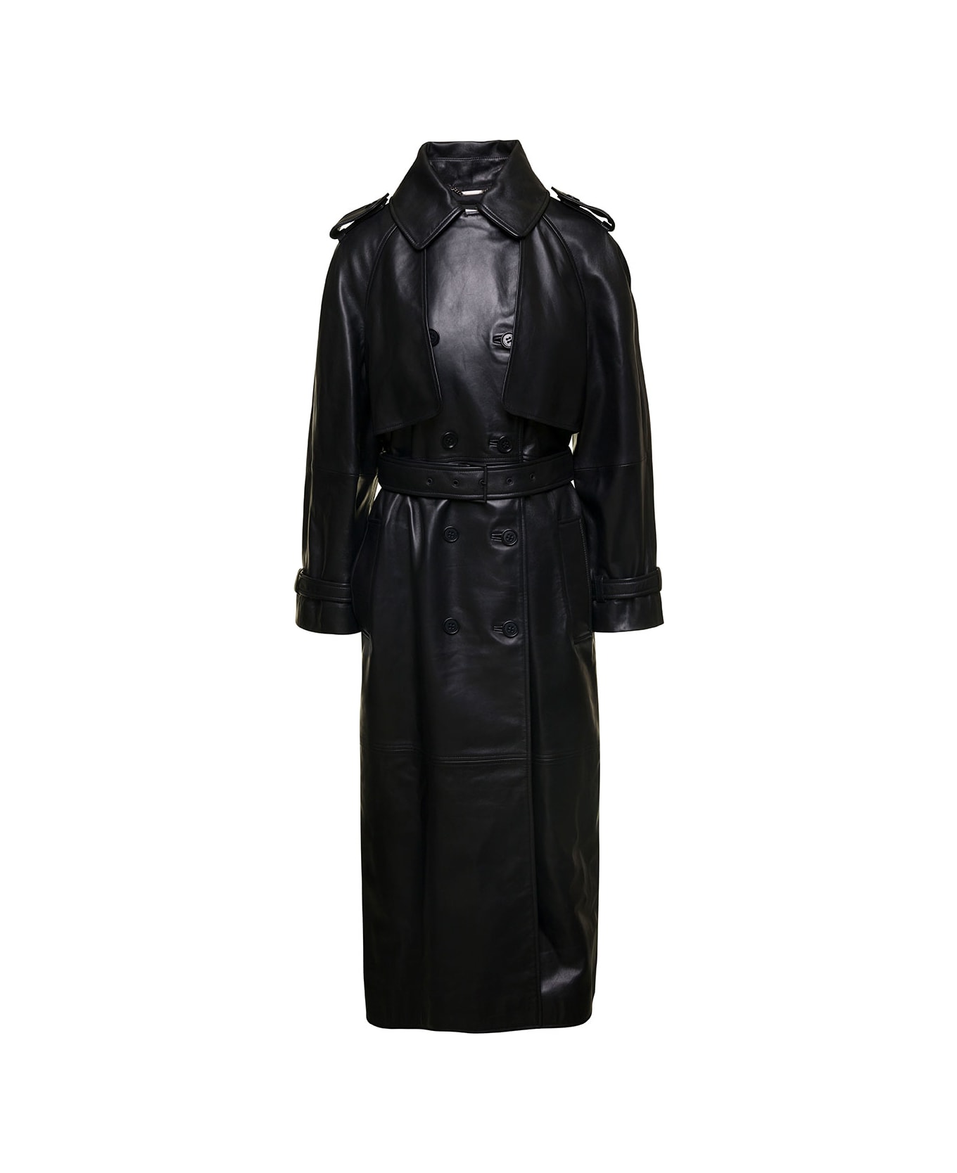 Double-breasted trench coat Classic collar Epaulettes Front button fastening Tonal buttons Adjustable waist belt Long sleeves Adjustable cuffs with belts Black Smooth leather Regular fit
