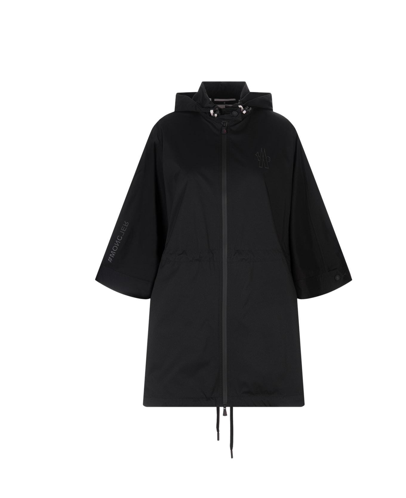 Black Vorassay raincoat signed Moncler Grenoble with tonal logo on chest, wide long sleeves, snap-button cuffs, double-slider front zipper closure, snap-button side pockets, and elastic drawstring on hem, hood, and waistband.