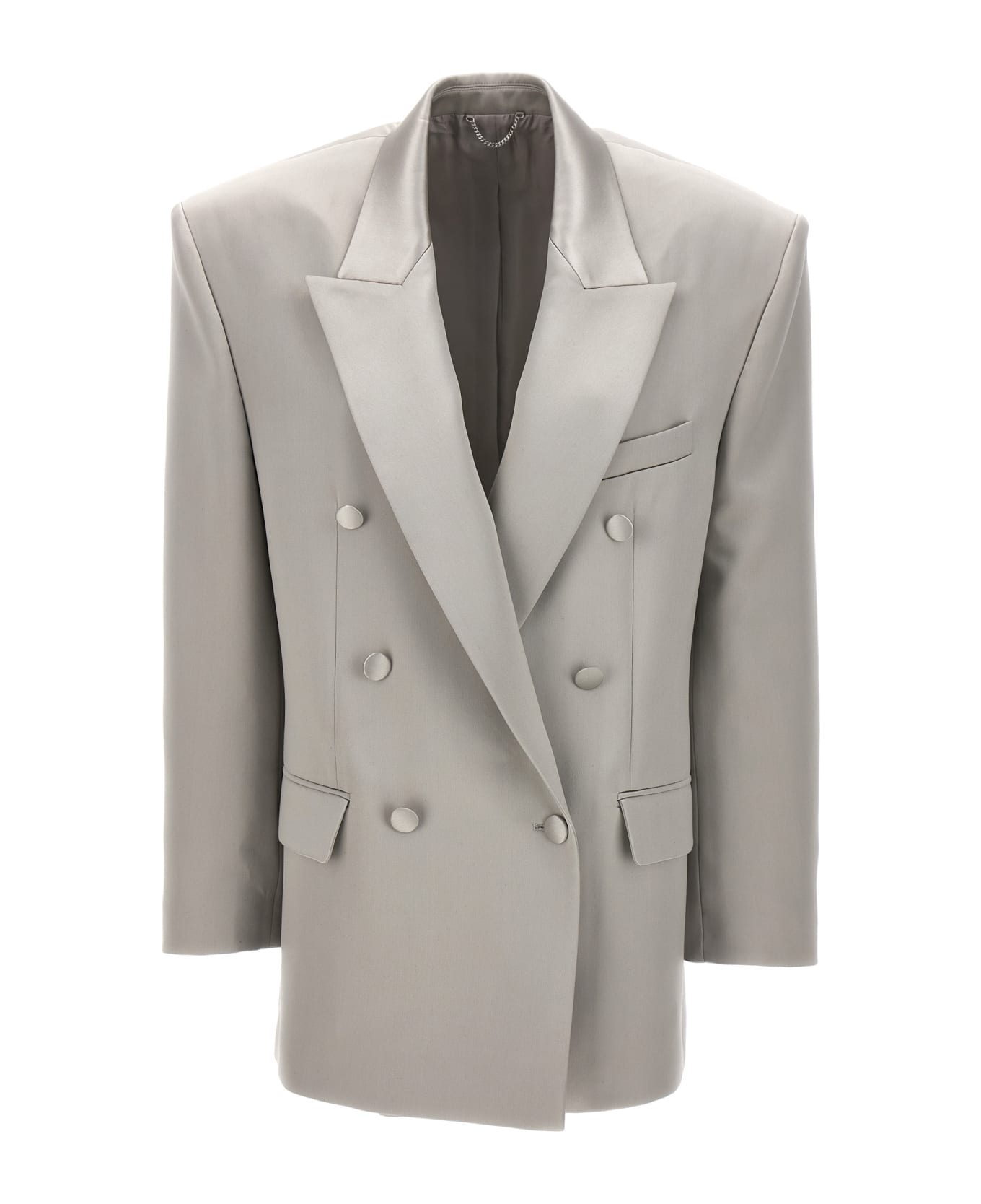 '01' oversized double-breasted silk blazer with button closure, peak lapels and flap pockets. Composition: 100% silk