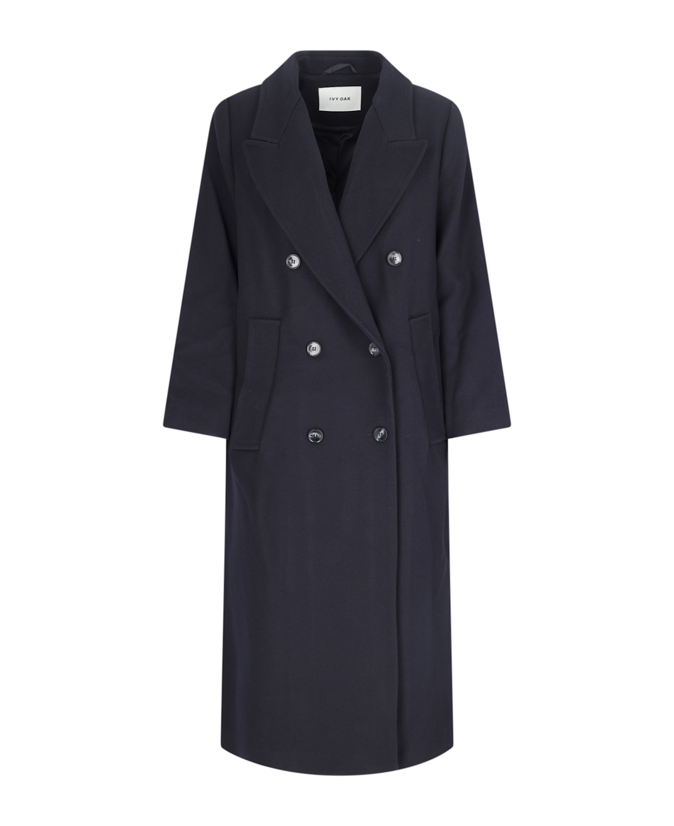 Ivy Oak 'Clemence' double-breasted coat in navy blue virgin wool blend with peak lapels, button closure, button cuffs, two front flap pockets, deep central vent at the back, straight hem.