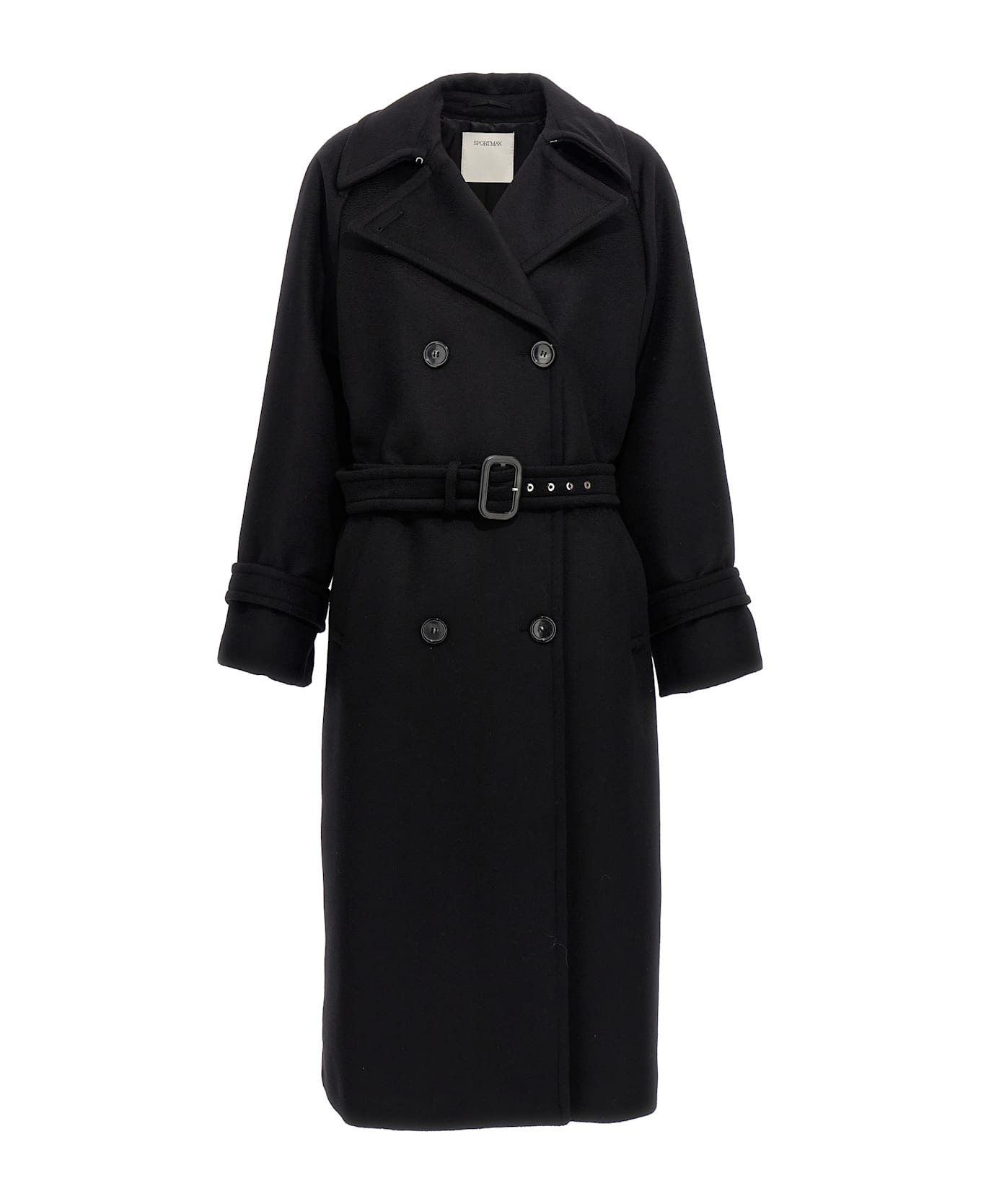 'Leandro' double-breasted coat in wool drap with button closure, matching waist belt, lapel collar, pockets, long sleeves with cuffed wings.