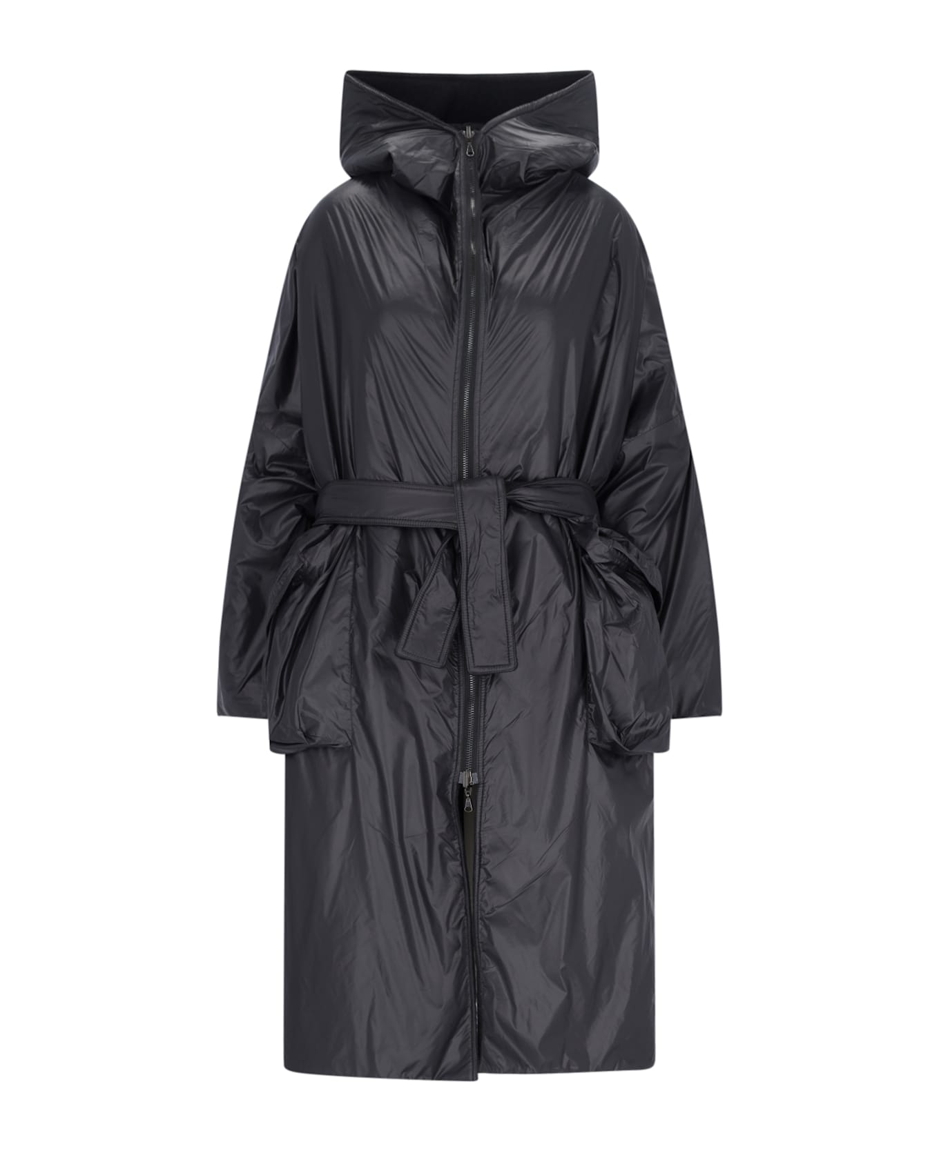 Kimo No-Rain maxi hooded down jacket with reversible design in black nylon with double zip closure, dropped shoulders, adjustable belt, two side patch pockets, tone-on-tone wool blend interior, two inner patch pockets, logo label on the bottom, straight hem.