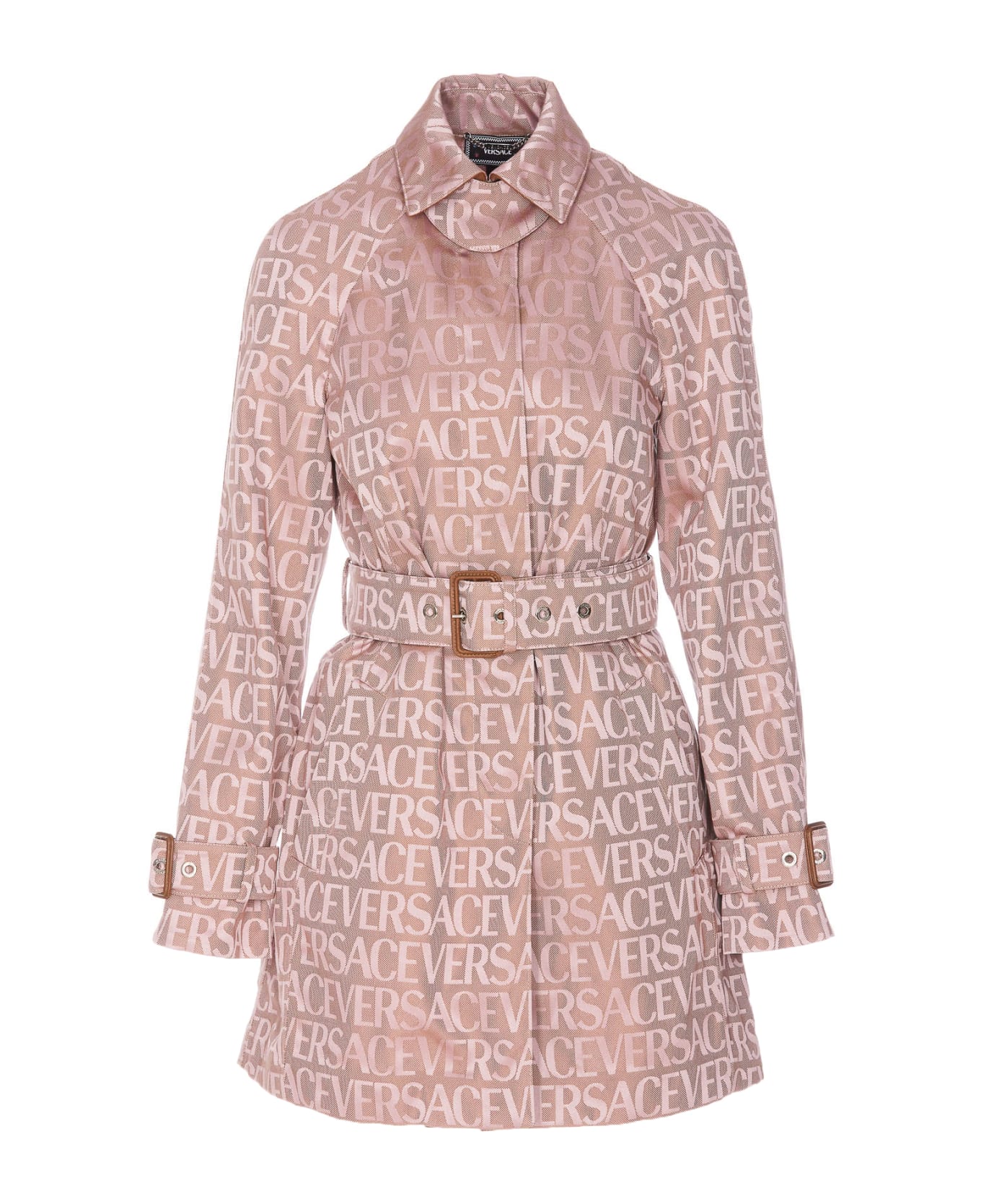 Versace pink trench, Versace Allover logo, frontal buttons closure, one silver logo button on collar, regular collar, belt detail on waist, lateral pockets, strap on cuffs Composition: 60% Polyester, 40% Cotton