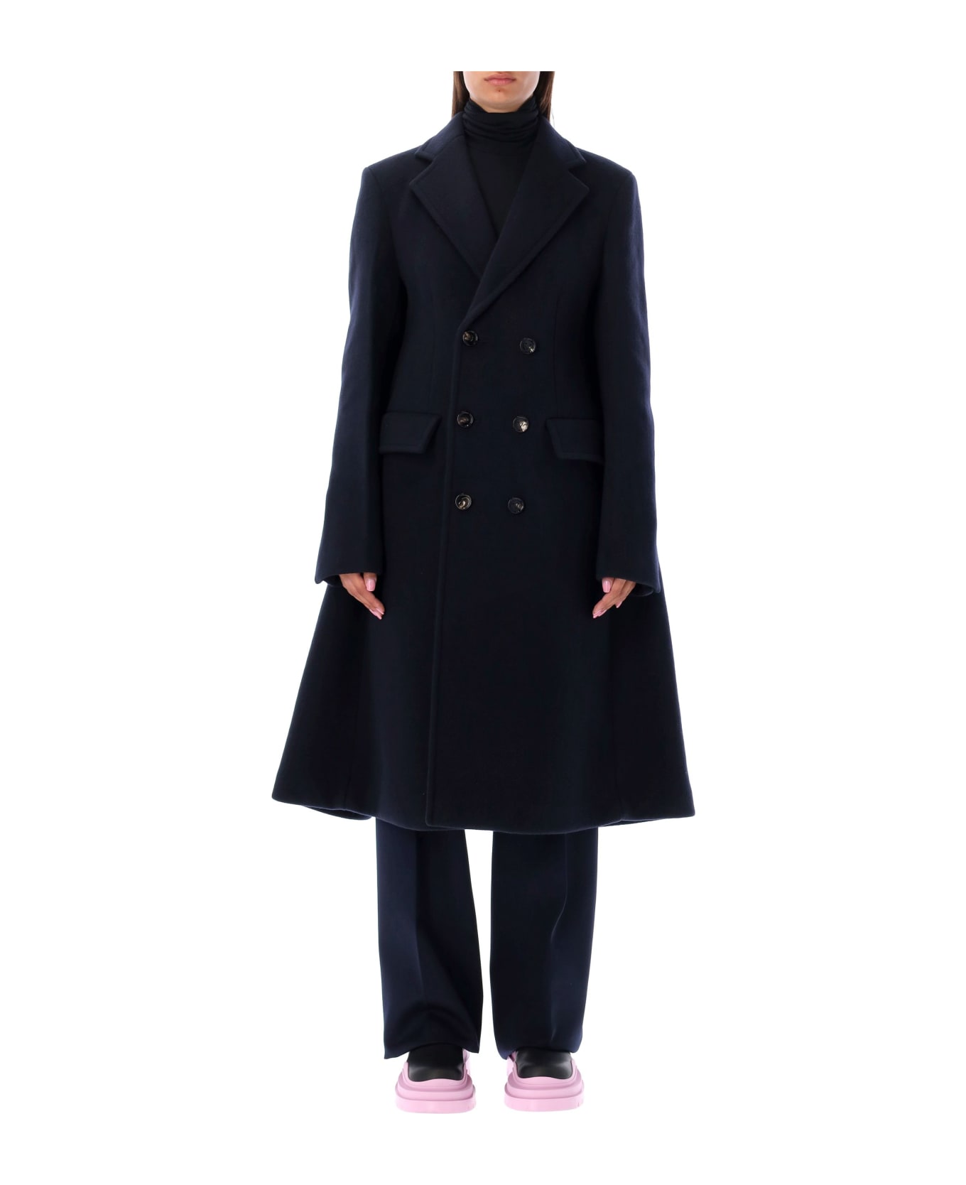 Wool And Cashmere Cape Coat By Bottega Veneta. Featuring: V-neck Long Sleeves Double Breast Button Closure At Front Flap Pockets At Front Flared Lined Regular Fit Model Is 1,72 M Tall And He Is Wearing Size 40