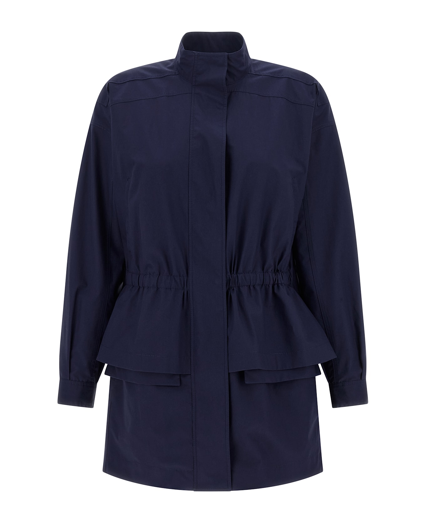 Cotton poplin jacket with Saharan lining, standing collar, front zip and snap button closure, pockets, peplos elastic waistband, long sleeves with cuffs and tone-on-tone embroidered logo, and back slit with button. Composition: 100% cotton