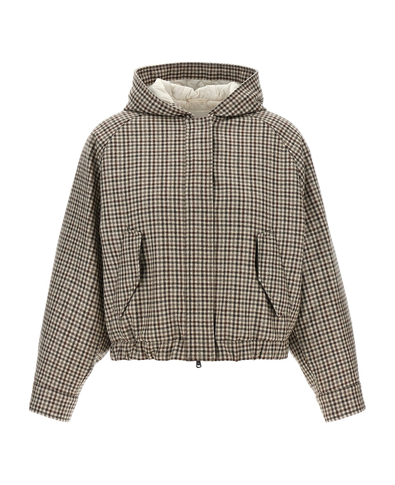 Check wool jacket slightly padded with goose down, quilted lining, hood, zip closure and snap buttons with 'Shiny Zipper Pull' in Monile on the front, pockets, long sleeves with cuffs, drawstring on the hem. Composition: 100% virgin wool