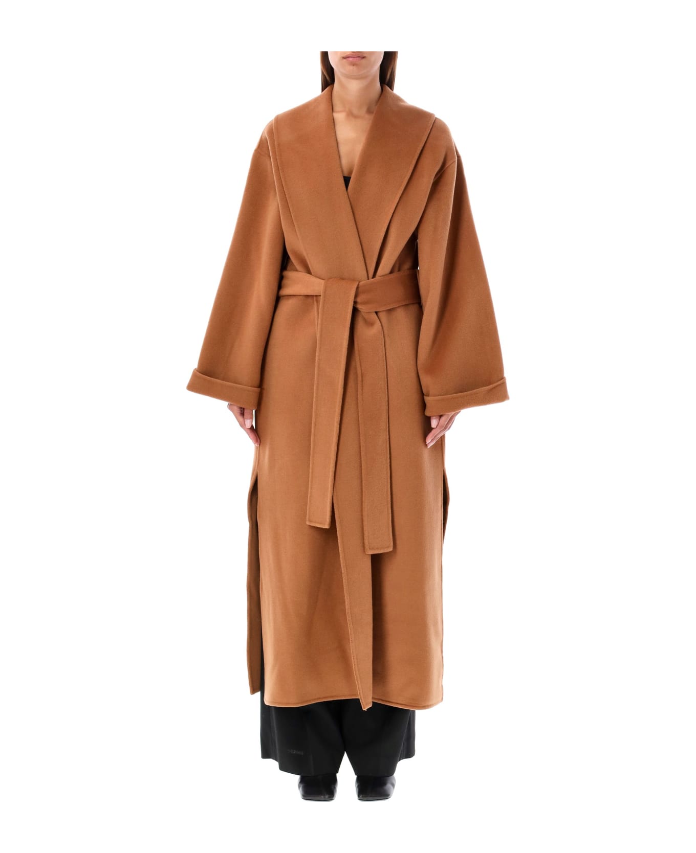Trullem Coat By Malene Birger. Featuring: Wool Fabric Relaxed, Oversized Fit Wide Shawl Collar Long Sleeves With Wide Cuffs Wrap Front With A Matching Belt Tie Full-length Design Side Slits Model Is 1,72m And Wears Size 36.